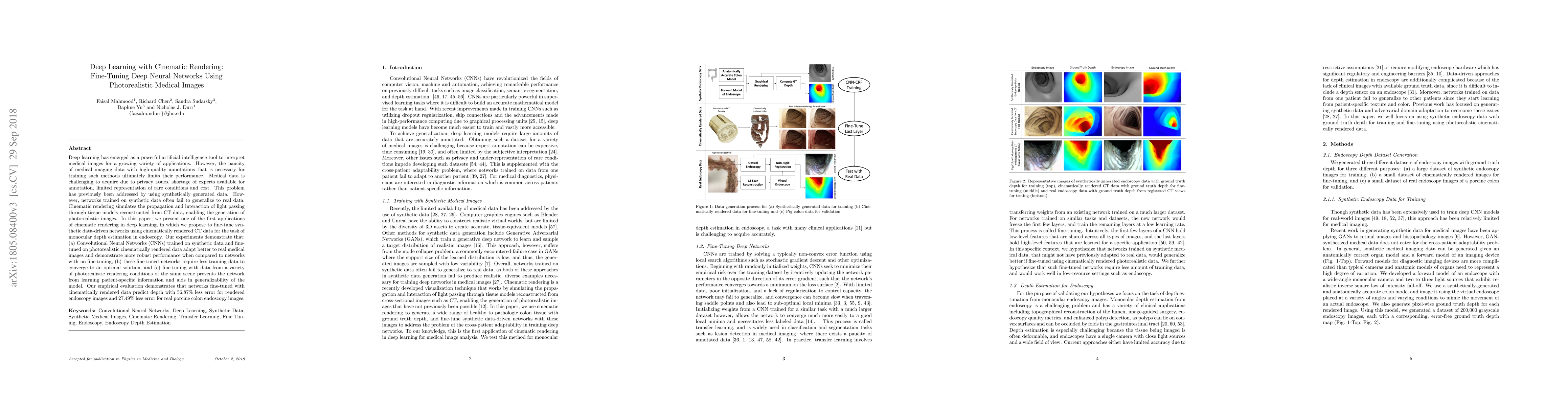 This paper explores fine-tuning deep neural networks using photorealistic medical images generated by cinematic rendering to improve monocular depth estimation in endoscopy. The study finds that networks fine-tuned with such data show better generalization to real images, require less training data, and maintain generalizability by avoiding patient-specific information.