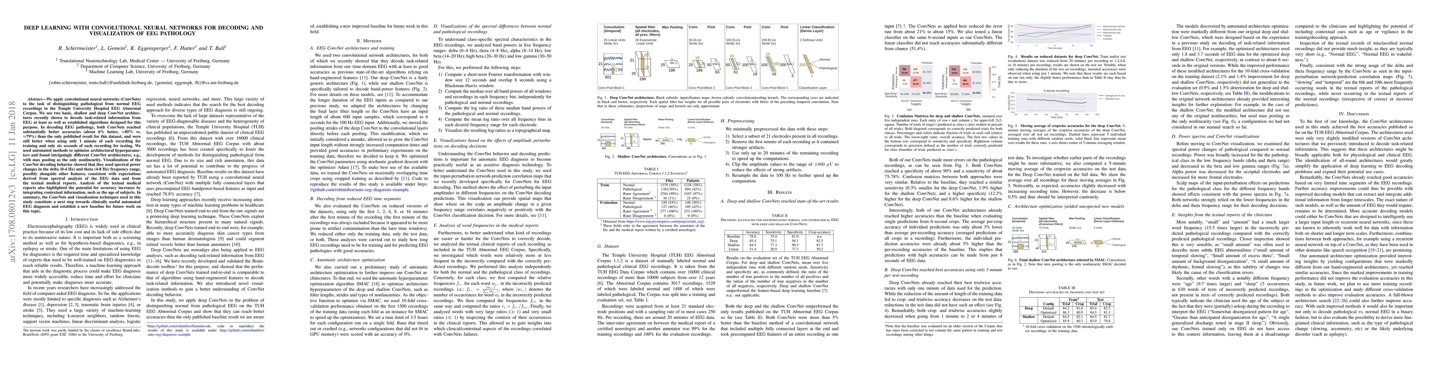 This study applies convolutional neural networks (ConvNets) to decode and visualize EEG pathology, achieving higher accuracy (about 6%) than previous methods in distinguishing pathological from normal EEG recordings. The ConvNets utilized spectral power changes in delta and theta frequency ranges, and integrating contextual information like subject age could further improve accuracy.