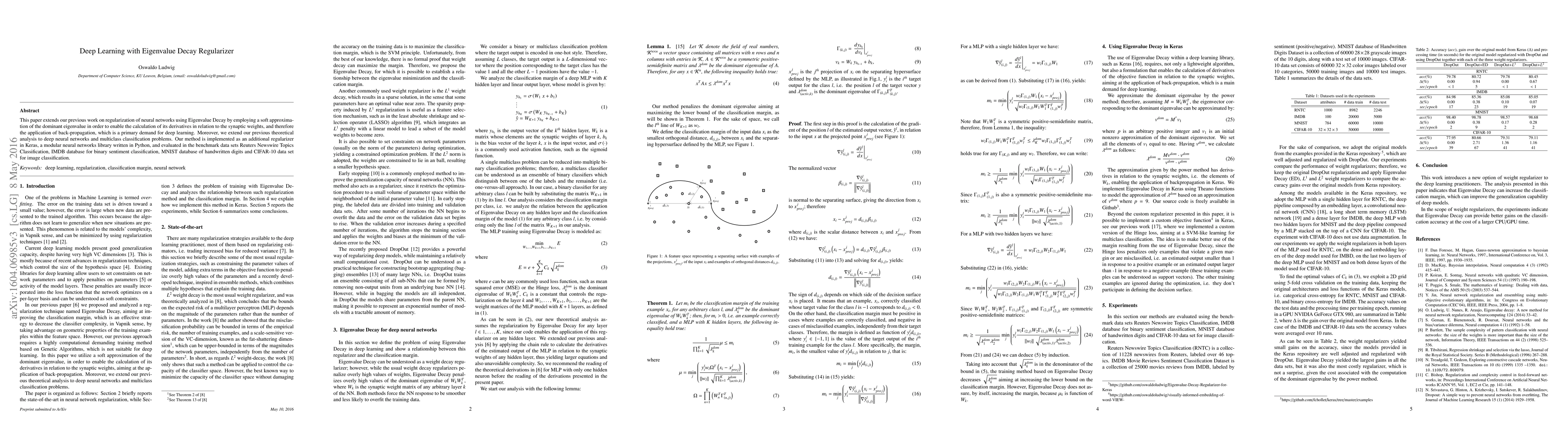 This paper extends our previous work on regularization of neural networks using Eigenvalue Decay by employing a soft approximation of the dominant eigenvalue in order to enable the calculation of its derivatives in relation to the synaptic weights, and therefore the application of back-propagation, which is a primary demand for deep learning. Moreover, we extend our previous theoretical analysis to deep neural networks and multiclass classification problems. Our method is implemented as an additional regularizer in Keras, a modular neural networks library written in Python, and evaluated in the benchmark data sets Reuters Newswire Topics Classification, IMDB database for binary sentiment classification, MNIST database of handwritten digits and CIFAR-10 data set for image classification.