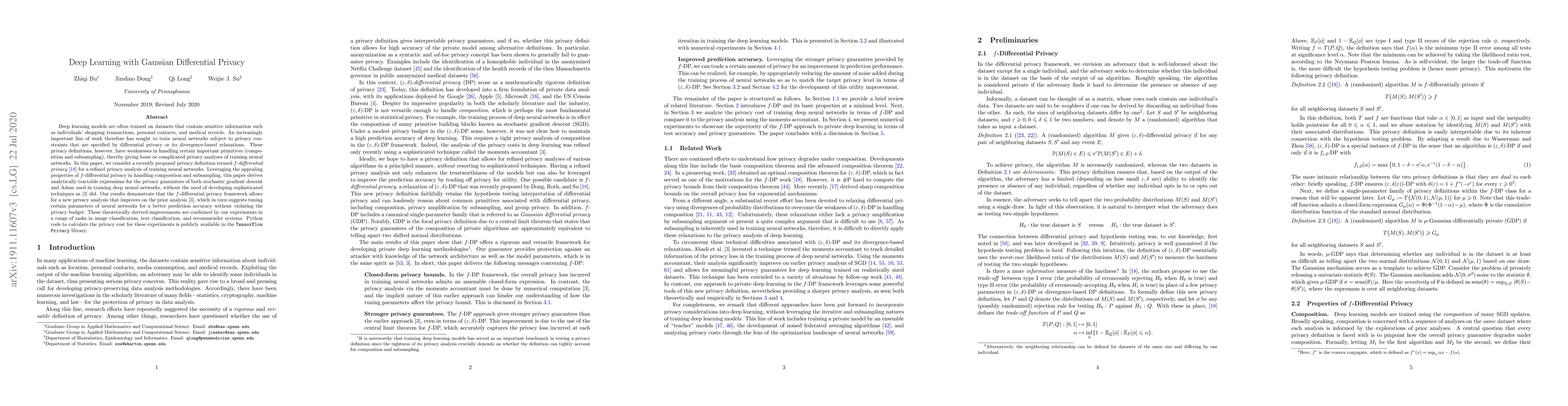 This paper proposes using $f$-differential privacy to refine the analysis of training deep learning models while maintaining privacy, offering improved analytical expressions for privacy guarantees over stochastic gradient descent and Adam. Experiments demonstrate enhanced prediction accuracy without exceeding privacy budgets, validated across image, text classification, and recommender systems.