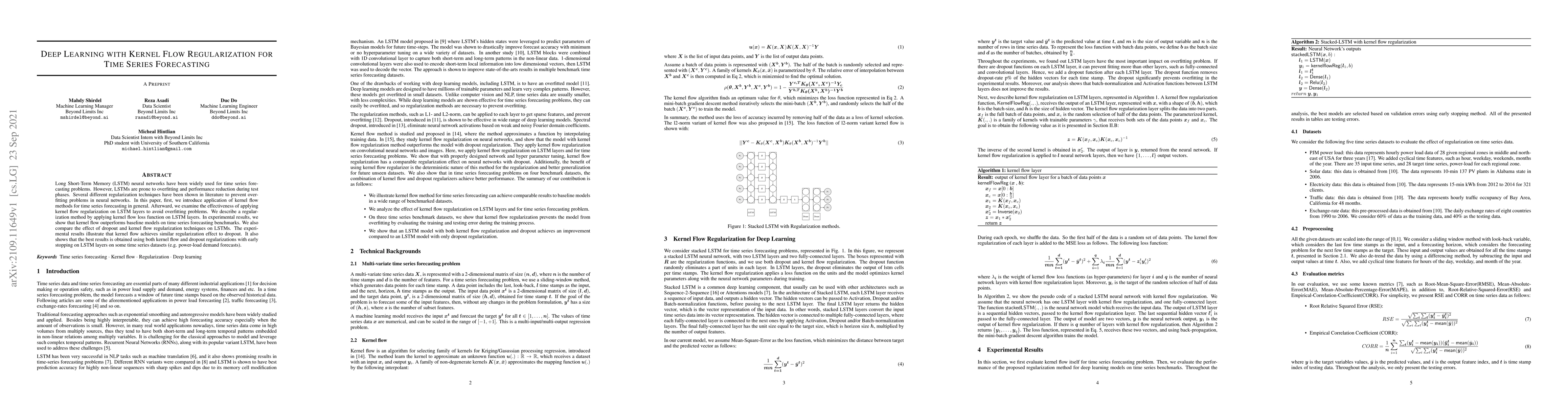 Long Short-Term Memory (LSTM) neural networks have been widely used for time series forecasting problems. However, LSTMs are prone to overfitting and performance reduction during test phases. Several different regularization techniques have been shown in literature to prevent overfitting problems in neural networks. In this paper, first, we introduce application of kernel flow methods for time series forecasting in general. Afterward, we examine the effectiveness of applying kernel flow regularization on LSTM layers to avoid overfitting problems. We describe a regularization method by applying kernel flow loss function on LSTM layers. In experimental results, we show that kernel flow outperforms baseline models on time series forecasting benchmarks. We also compare the effect of dropout and kernel flow regularization techniques on LSTMs. The experimental results illustrate that kernel flow achieves similar regularization effect to dropout. It also shows that the best results is obtained using both kernel flow and dropout regularizations with early stopping on LSTM layers on some time series datasets (e.g. power-load demand forecasts).
