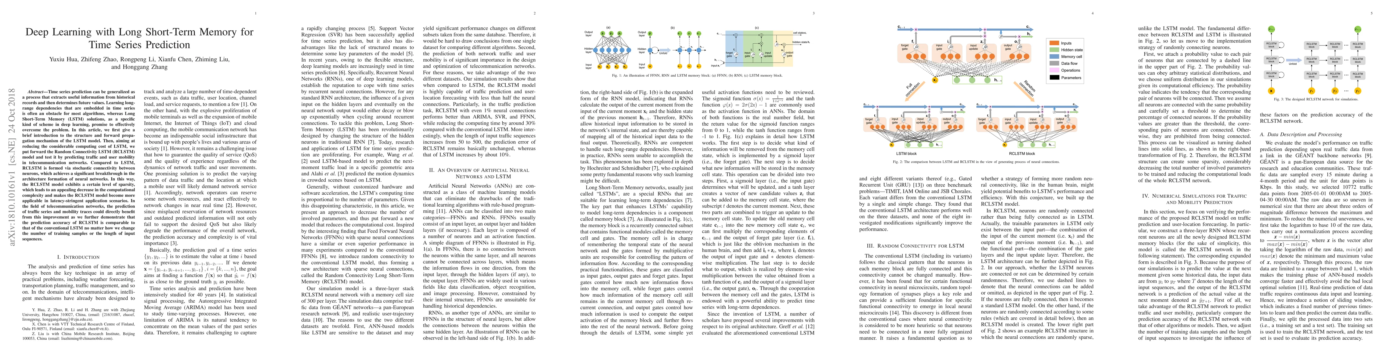 This paper introduces the Long Short-Term Memory (LSTM) model for time series prediction, highlighting its ability to learn long-range dependencies. It proposes the Random Connectivity LSTM (RCLSTM) to reduce computational costs while maintaining prediction accuracy, demonstrating its effectiveness in predicting traffic and user mobility in telecommunication networks.