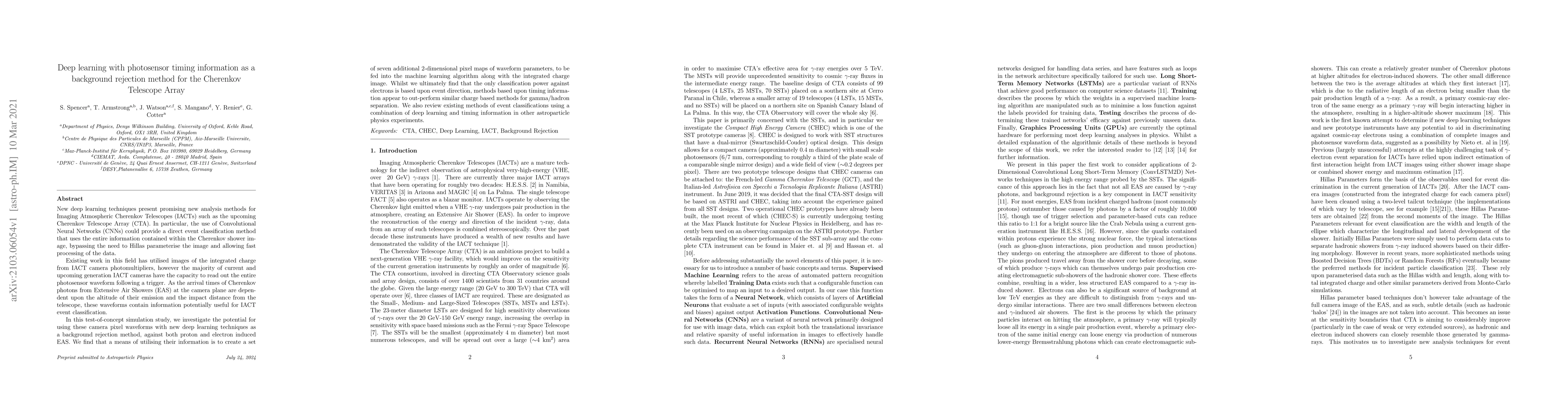 New deep learning techniques present promising new analysis methods for Imaging Atmospheric Cherenkov Telescopes (IACTs) such as the upcoming Cherenkov Telescope Array (CTA). In particular, the use of Convolutional Neural Networks (CNNs) could provide a direct event classification method that uses the entire information contained within the Cherenkov shower image, bypassing the need to Hillas parameterise the image and allowing fast processing of the data. Existing work in this field has utilised images of the integrated charge from IACT camera photomultipliers, however the majority of current and upcoming generation IACT cameras have the capacity to read out the entire photosensor waveform following a trigger. As the arrival times of Cherenkov photons from Extensive Air Showers (EAS) at the camera plane are dependent upon the altitude of their emission and the impact distance from the telescope, these waveforms contain information potentially useful for IACT event classification. In this test-of-concept simulation study, we investigate the potential for using these camera pixel waveforms with new deep learning techniques as a background rejection method, against both proton and electron induced EAS. We find that a means of utilising their information is to create a set of seven additional 2-dimensional pixel maps of waveform parameters, to be fed into the machine learning algorithm along with the integrated charge image. Whilst we ultimately find that the only classification power against electrons is based upon event direction, methods based upon timing information appear to out-perform similar charge based methods for gamma/hadron separation. We also review existing methods of event classifications using a combination of deep learning and timing information in other astroparticle physics experiments.