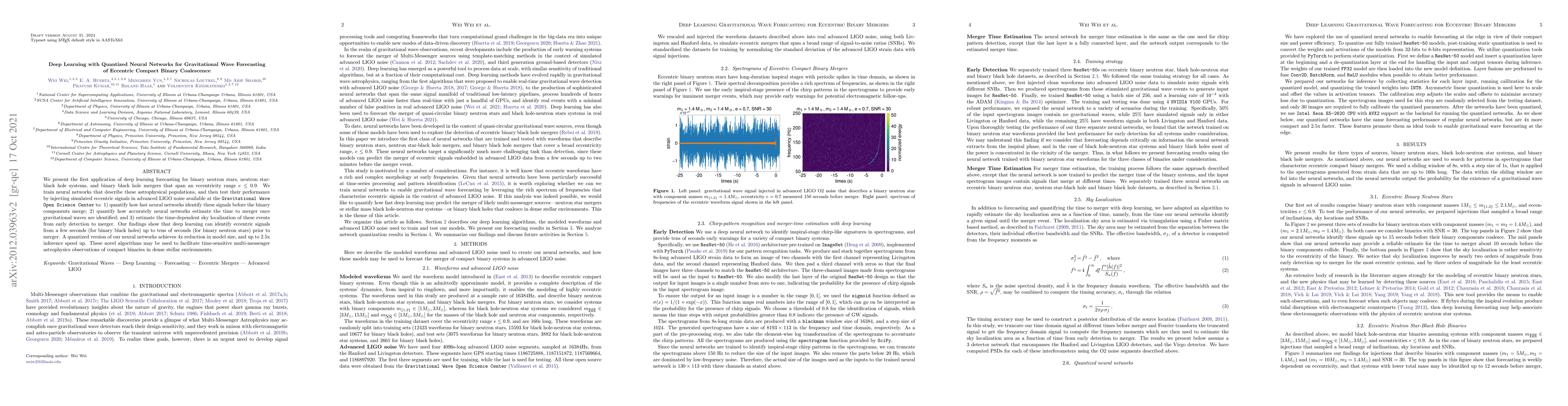 This paper applies deep learning to forecast gravitational waves from eccentric compact binary coalescences, demonstrating the ability of neural networks to identify and estimate the merger time of neutron star and black hole systems. Quantized neural networks reduce model size and speed up inference, potentially aiding real-time multi-messenger astrophysics.