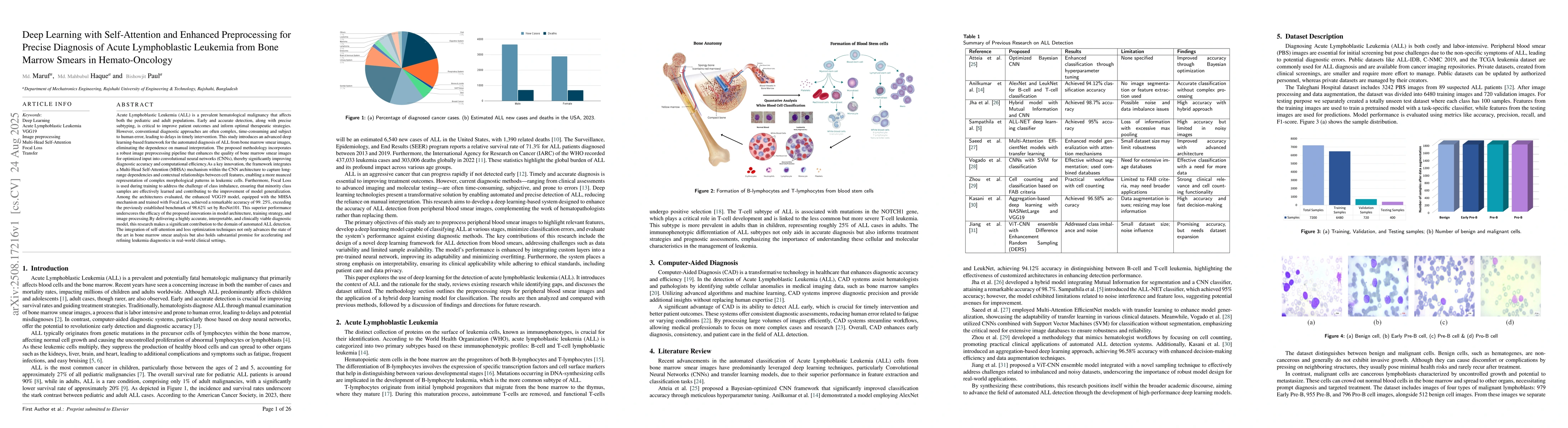 Acute lymphoblastic leukemia (ALL) is a prevalent hematological malignancy in both pediatric and adult populations. Early and accurate detection with precise subtyping is essential for guiding therapy. Conventional workflows are complex, time-consuming, and prone to human error. We present a deep learning framework for automated ALL diagnosis from bone marrow smear images. The method combines a robust preprocessing pipeline with convolutional neural networks (CNNs) to standardize image quality and improve inference efficiency. As a key design, we insert a multi-head self-attention (MHSA) block into a VGG19 backbone to model long-range dependencies and contextual relationships among cellular features. To mitigate class imbalance, we train with Focal Loss. Across evaluated architectures, the enhanced VGG19+MHSA trained with Focal Loss achieves 99.25% accuracy, surpassing a strong ResNet101 baseline (98.62%). These results indicate that attention-augmented CNNs, coupled with targeted loss optimization and preprocessing, yield more discriminative representations of leukemic cell morphology. Our approach offers a highly accurate and computationally efficient tool for automated ALL recognition and subtyping, with potential to accelerate diagnostic workflows and support reliable decision-making in clinical settings.