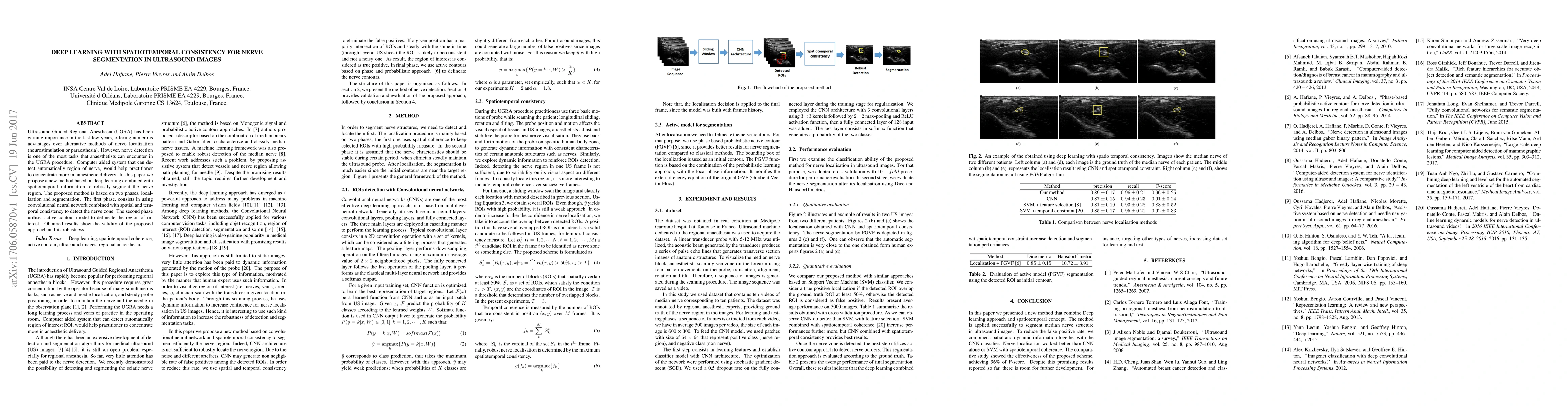 Ultrasound-Guided Regional Anesthesia (UGRA) has been gaining importance in the last few years, offering numerous advantages over alternative methods of nerve localization (neurostimulation or paraesthesia). However, nerve detection is one of the most tasks that anaesthetists can encounter in the UGRA procedure. Computer aided system that can detect automatically region of nerve, would help practitioner to concentrate more in anaesthetic delivery. In this paper we propose a new method based on deep learning combined with spatiotemporal information to robustly segment the nerve region. The proposed method is based on two phases, localisation and segmentation. The first phase, consists in using convolutional neural network combined with spatial and temporal consistency to detect the nerve zone. The second phase utilises active contour model to delineate the region of interest. Obtained results show the validity of the proposed approach and its robustness.