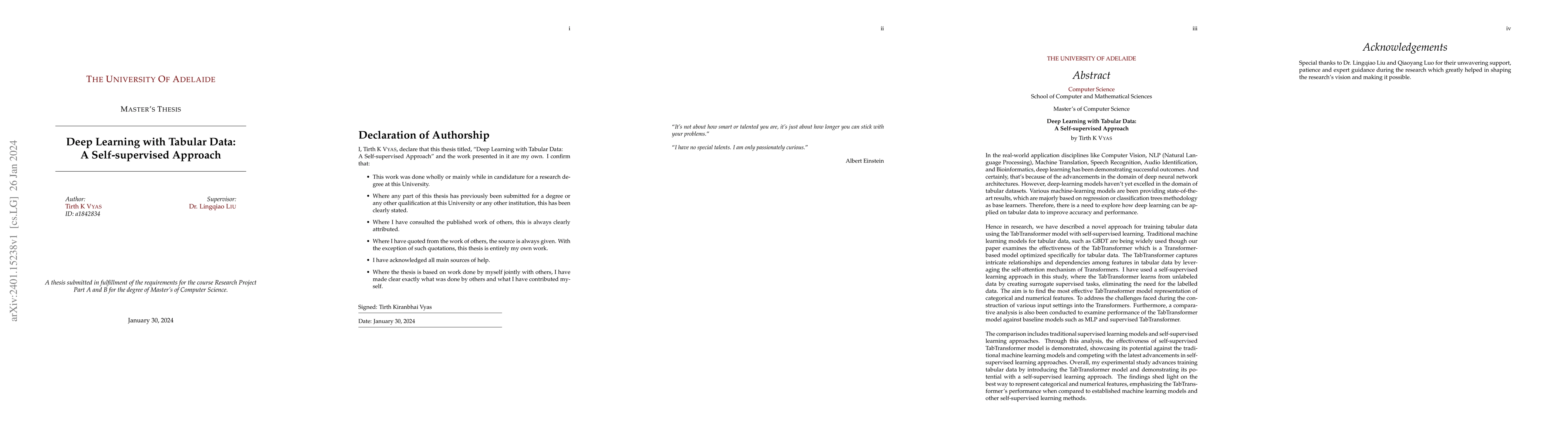 This paper proposes a self-supervised TabTransformer model for tabular data, leveraging the self-attention mechanism to capture feature dependencies. It employs a masking-based unsupervised learning approach to train without labelled data, and compares the performance of different TabTransformer variants against traditional models like MLP and supervised TabTransformer, finding it more effective for capturing intricate relationships in tabular datasets.