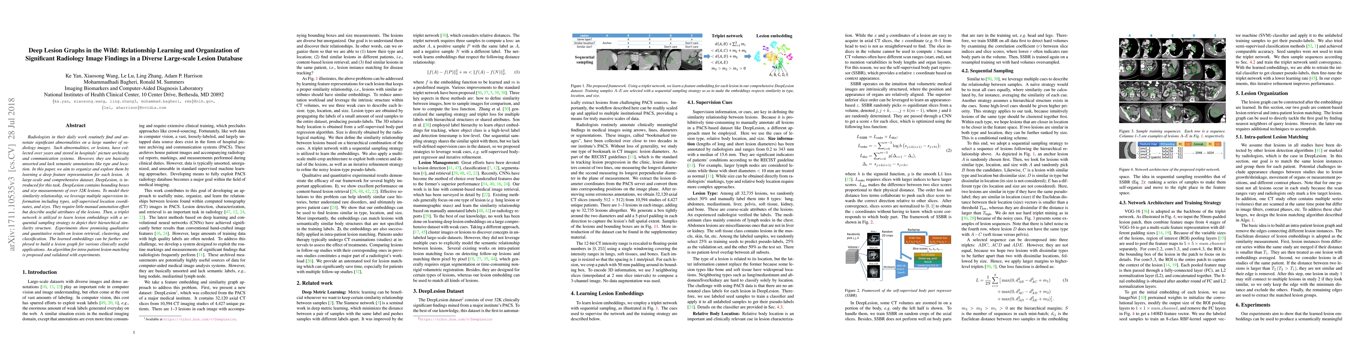 This paper introduces DeepLesion, a large-scale dataset for organizing radiology image findings, and proposes a deep feature representation to learn the hierarchical similarity structure of lesions using a triplet network. The embeddings enable effective lesion retrieval, clustering, and classification, and support applications like intra-patient lesion matching and missing annotation mining.