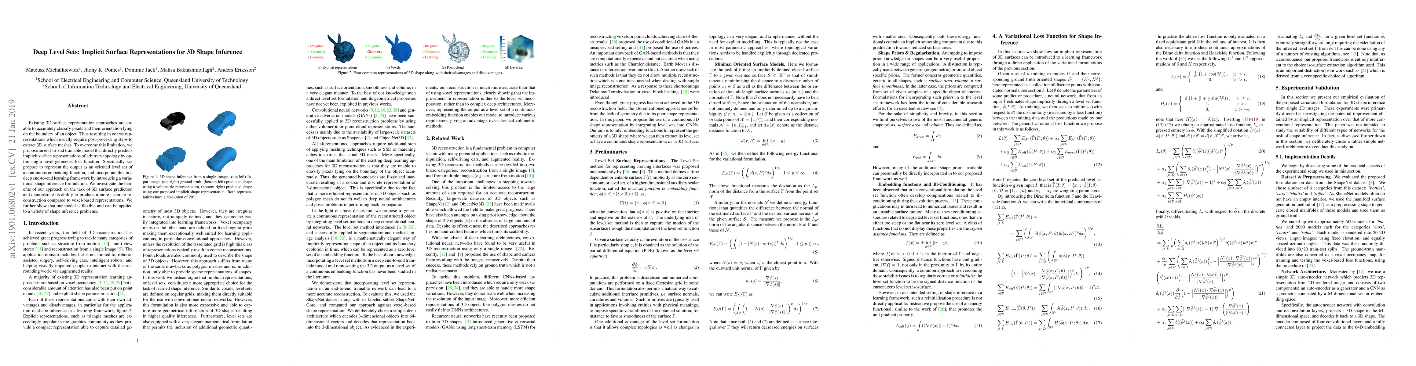 This paper proposes an end-to-end trainable model for 3D shape inference that directly predicts implicit surface representations using an oriented level set of a continuous embedding function. The model demonstrates improved accuracy and flexibility over traditional voxel-based methods, offering a more precise reconstruction of 3D surfaces.