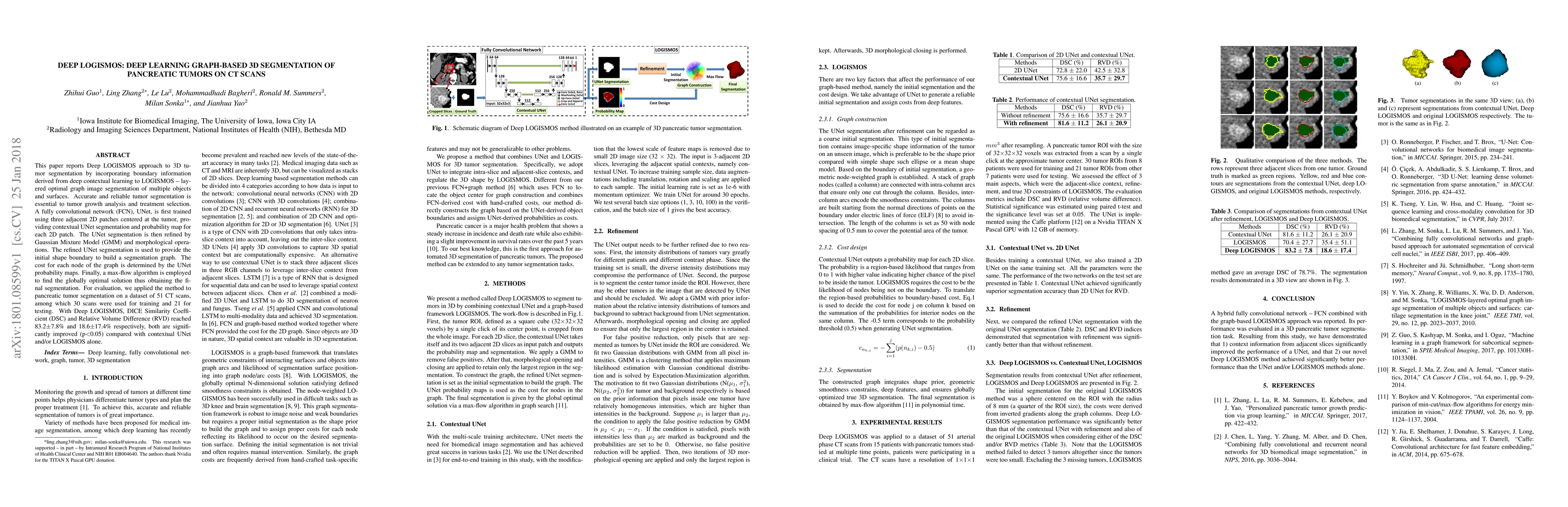 Deep LOGISMOS integrates deep learning with graph-based segmentation for 3D pancreatic tumor segmentation on CT scans, achieving improved DICE and RVD metrics compared to standalone UNet and LOGISMOS methods. The approach combines UNet segmentation refinement with a max-flow algorithm for optimal tumor boundary delineation.