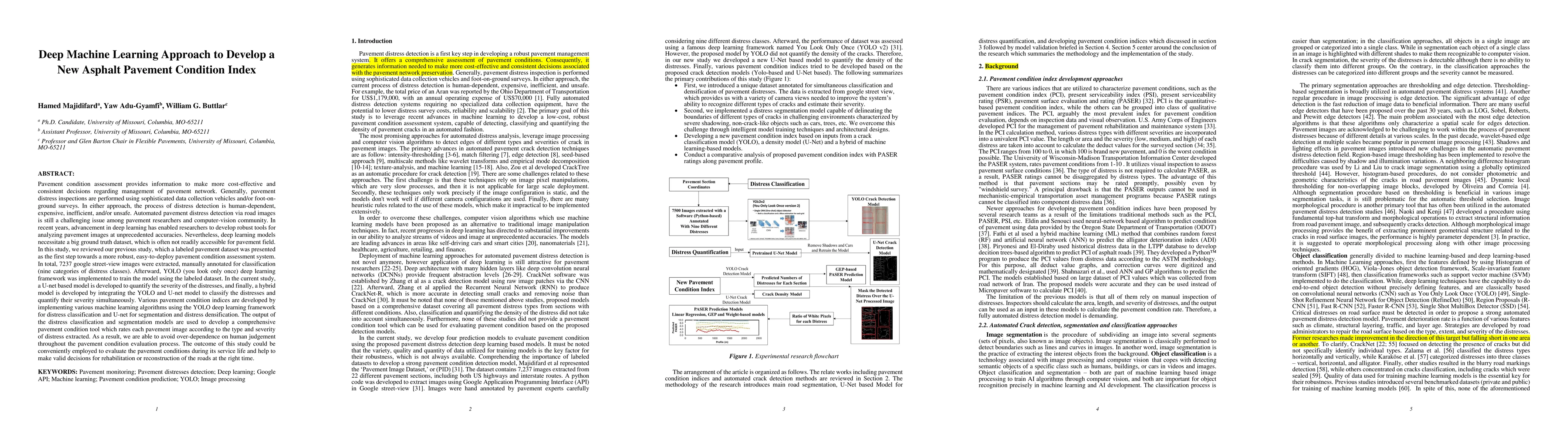 This paper explores the development of a deep machine learning approach to assess asphalt pavement condition using Google Street View images. The study combines YOLO and U-net models to classify and quantify pavement distress severity, creating a comprehensive pavement condition index tool.