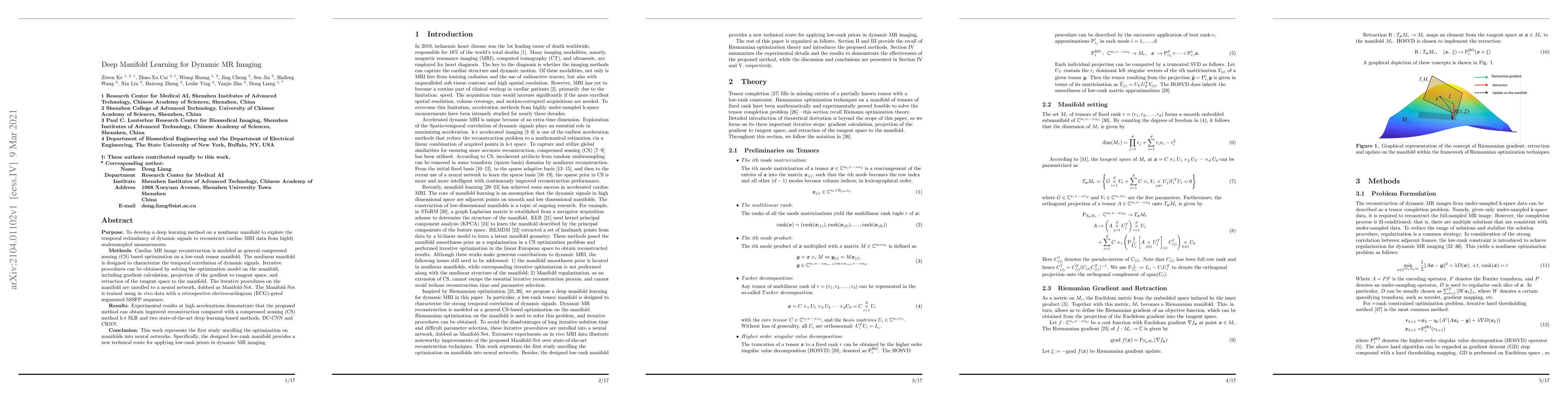 This paper proposes a deep learning method called Manifold-Net for reconstructing cardiac MRI data from undersampled measurements by modeling the temporal redundancy of dynamic signals on a nonlinear manifold. The results show that Manifold-Net outperforms traditional compressed sensing and other deep learning methods in reconstruction quality at high accelerations.