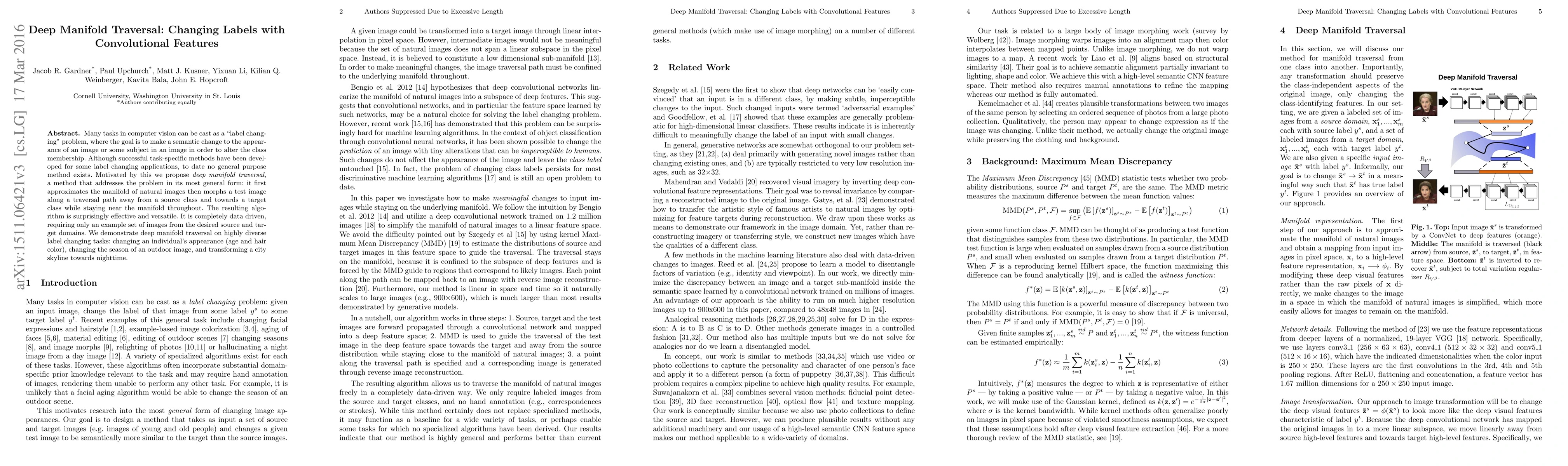 Many tasks in computer vision can be cast as a "label changing" problem, where the goal is to make a semantic change to the appearance of an image or some subject in an image in order to alter the class membership. Although successful task-specific methods have been developed for some label changing applications, to date no general purpose method exists. Motivated by this we propose deep manifold traversal, a method that addresses the problem in its most general form: it first approximates the manifold of natural images then morphs a test image along a traversal path away from a source class and towards a target class while staying near the manifold throughout. The resulting algorithm is surprisingly effective and versatile. It is completely data driven, requiring only an example set of images from the desired source and target domains. We demonstrate deep manifold traversal on highly diverse label changing tasks: changing an individual's appearance (age and hair color), changing the season of an outdoor image, and transforming a city skyline towards nighttime.