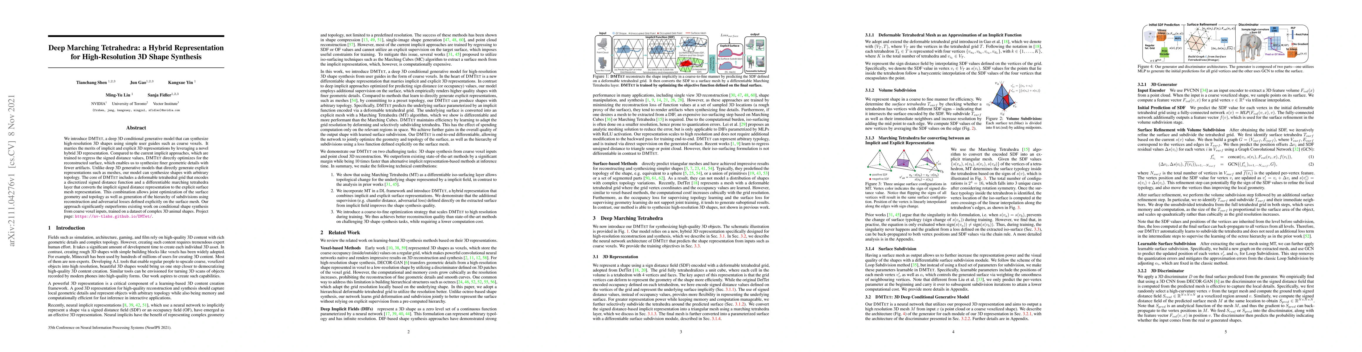 The paper introduces DMTet, a deep 3D conditional generative model that synthesizes high-resolution 3D shapes using coarse voxels as simple user guides. It combines implicit and explicit 3D representations through a novel hybrid representation, optimizing directly for the reconstructed surface rather than signed distance values. DMTet employs a deformable tetrahedral grid encoding a discretized signed distance function and a differentiable marching tetrahedra layer converting the implicit signed distance representation to an explicit surface mesh.