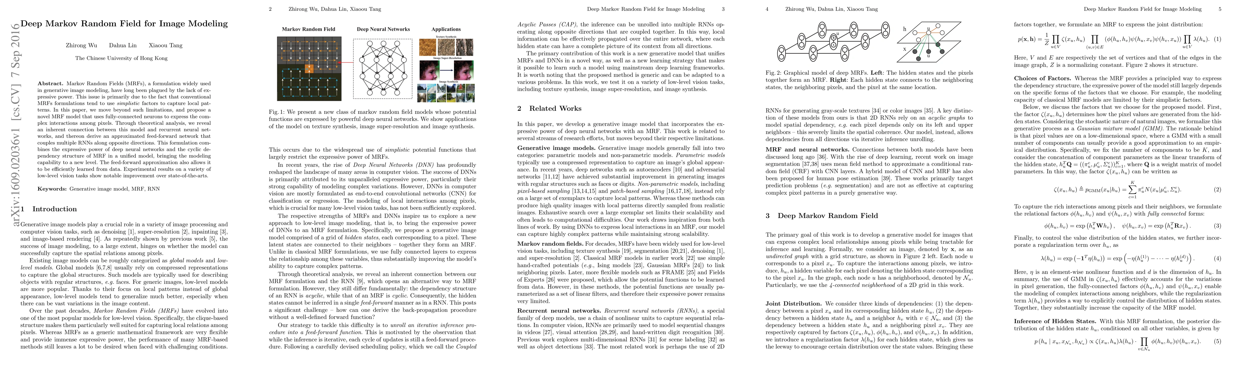 Markov Random Fields (MRFs), a formulation widely used in generative image modeling, have long been plagued by the lack of expressive power. This issue is primarily due to the fact that conventional MRFs formulations tend to use simplistic factors to capture local patterns. In this paper, we move beyond such limitations, and propose a novel MRF model that uses fully-connected neurons to express the complex interactions among pixels. Through theoretical analysis, we reveal an inherent connection between this model and recurrent neural networks, and thereon derive an approximated feed-forward network that couples multiple RNNs along opposite directions. This formulation combines the expressive power of deep neural networks and the cyclic dependency structure of MRF in a unified model, bringing the modeling capability to a new level. The feed-forward approximation also allows it to be efficiently learned from data. Experimental results on a variety of low-level vision tasks show notable improvement over state-of-the-arts.