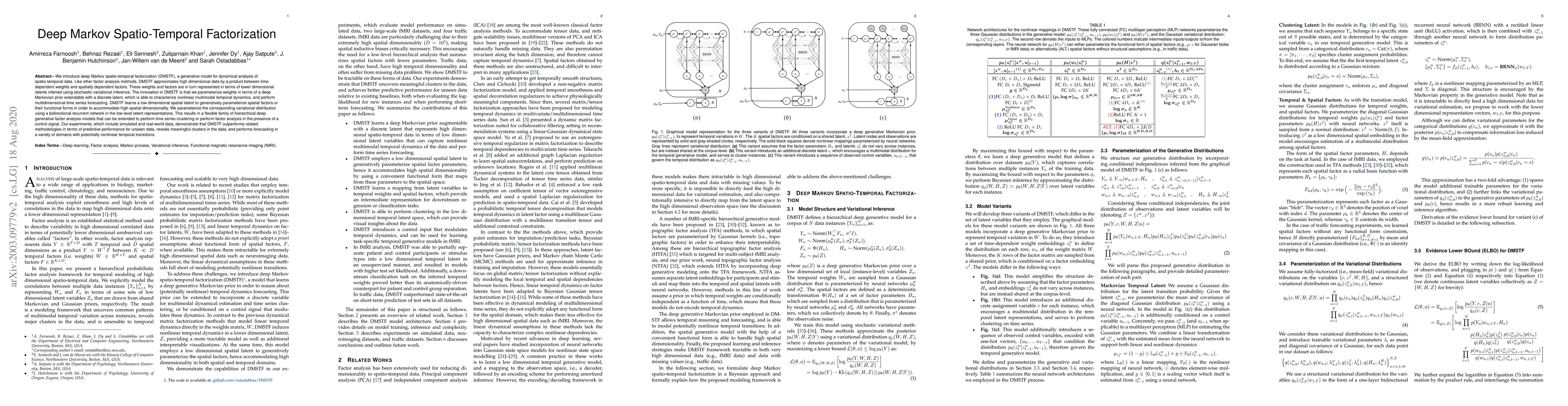 We introduce deep Markov spatio-temporal factorization (DMSTF), a generative model for dynamical analysis of spatio-temporal data. Like other factor analysis methods, DMSTF approximates high dimensional data by a product between time dependent weights and spatially dependent factors. These weights and factors are in turn represented in terms of lower dimensional latents inferred using stochastic variational inference. The innovation in DMSTF is that we parameterize weights in terms of a deep Markovian prior extendable with a discrete latent, which is able to characterize nonlinear multimodal temporal dynamics, and perform multidimensional time series forecasting. DMSTF learns a low dimensional spatial latent to generatively parameterize spatial factors or their functional forms in order to accommodate high spatial dimensionality. We parameterize the corresponding variational distribution using a bidirectional recurrent network in the low-level latent representations. This results in a flexible family of hierarchical deep generative factor analysis models that can be extended to perform time series clustering or perform factor analysis in the presence of a control signal. Our experiments, which include simulated and real-world data, demonstrate that DMSTF outperforms related methodologies in terms of predictive performance for unseen data, reveals meaningful clusters in the data, and performs forecasting in a variety of domains with potentially nonlinear temporal transitions.