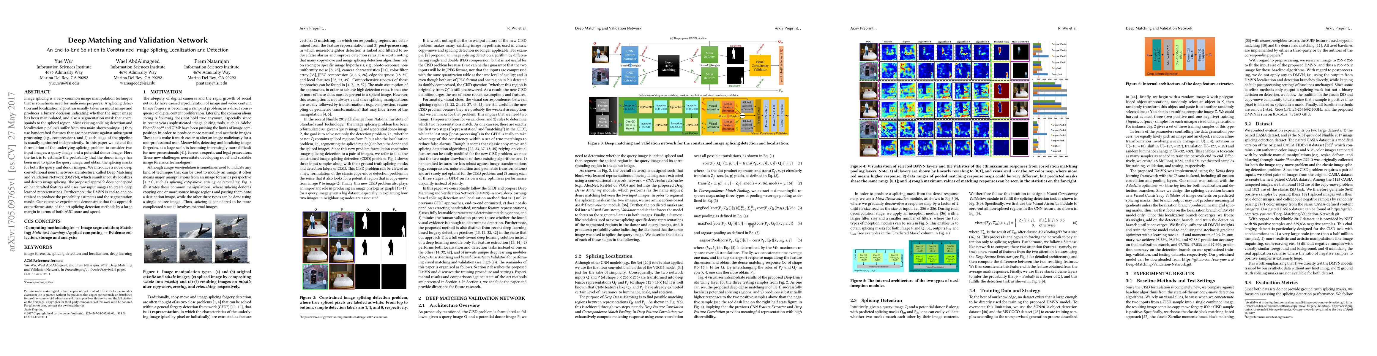 Image splicing is a very common image manipulation technique that is sometimes used for malicious purposes. A splicing detec- tion and localization algorithm usually takes an input image and produces a binary decision indicating whether the input image has been manipulated, and also a segmentation mask that corre- sponds to the spliced region. Most existing splicing detection and localization pipelines suffer from two main shortcomings: 1) they use handcrafted features that are not robust against subsequent processing (e.g., compression), and 2) each stage of the pipeline is usually optimized independently. In this paper we extend the formulation of the underlying splicing problem to consider two input images, a query image and a potential donor image. Here the task is to estimate the probability that the donor image has been used to splice the query image, and obtain the splicing masks for both the query and donor images. We introduce a novel deep convolutional neural network architecture, called Deep Matching and Validation Network (DMVN), which simultaneously localizes and detects image splicing. The proposed approach does not depend on handcrafted features and uses raw input images to create deep learned representations. Furthermore, the DMVN is end-to-end op- timized to produce the probability estimates and the segmentation masks. Our extensive experiments demonstrate that this approach outperforms state-of-the-art splicing detection methods by a large margin in terms of both AUC score and speed.