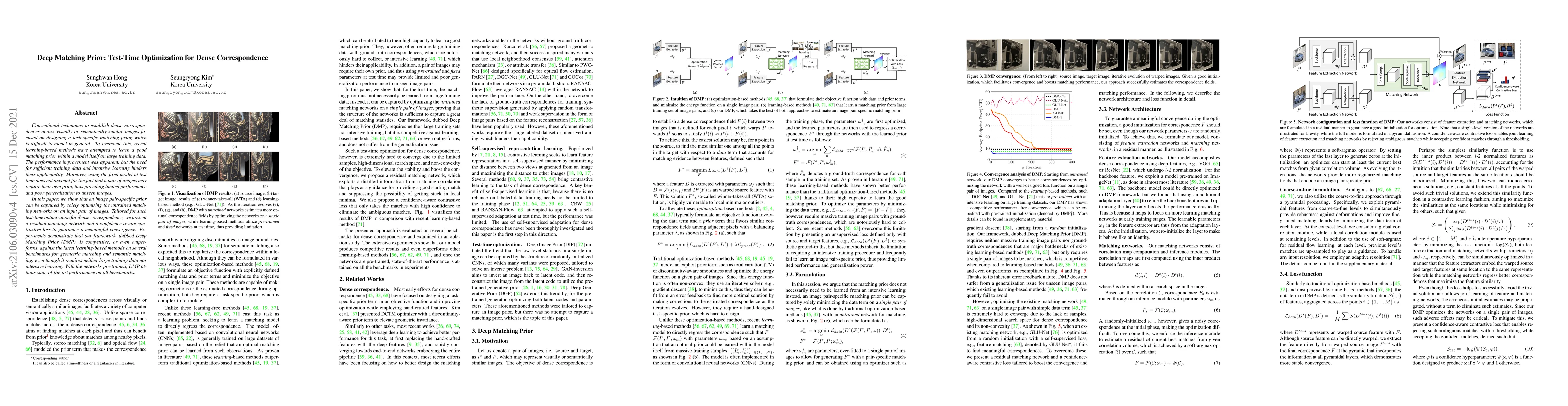 The paper proposes Deep Matching Prior (DMP), a test-time optimization framework that optimizes untrained matching networks on input image pairs to establish dense correspondences without requiring large training datasets or intensive learning. DMP uses a residual matching network and a confidence-aware contrastive loss, achieving competitive performance against state-of-the-art learning-based methods.