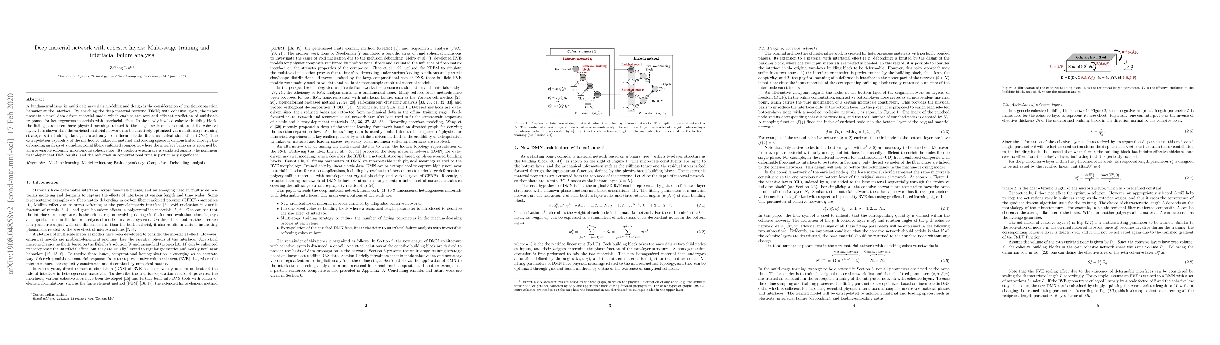 This paper introduces a deep material network enriched with cohesive layers for multiscale modeling, enabling accurate predictions of heterogeneous materials' responses. The model's parameters relate to cohesive layer length scale and orientation, optimized through a multi-stage training strategy, demonstrating significant computational efficiency and predictive accuracy in debonding analysis.