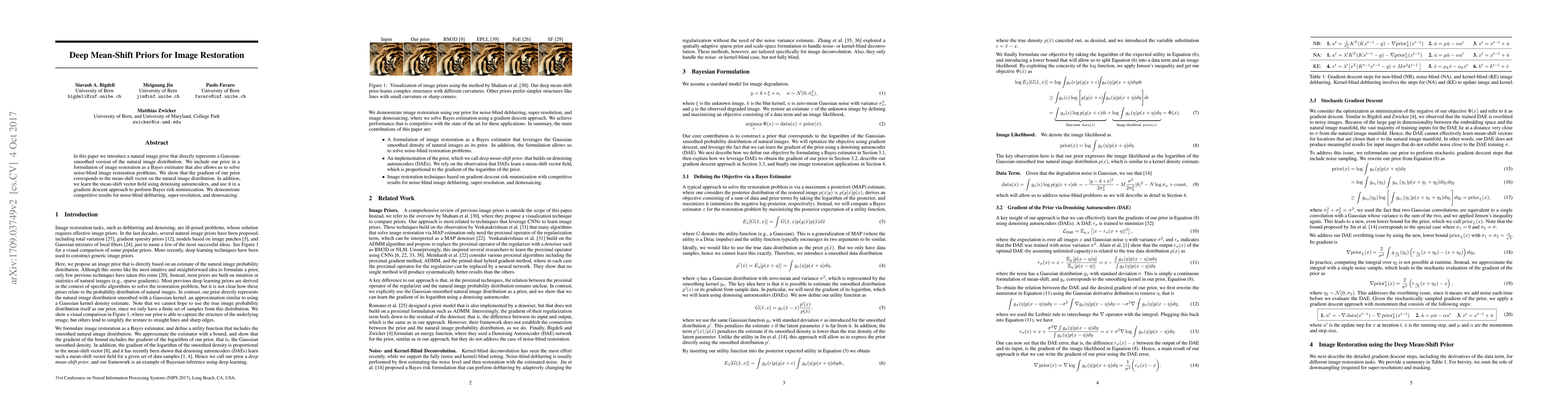 This paper proposes a Gaussian-smoothed natural image distribution prior for image restoration, framed as a Bayes estimator that enables noise-blind restoration. The method learns mean-shift vector fields using denoising autoencoders and achieves competitive results in deblurring, super-resolution, and demosaicing.