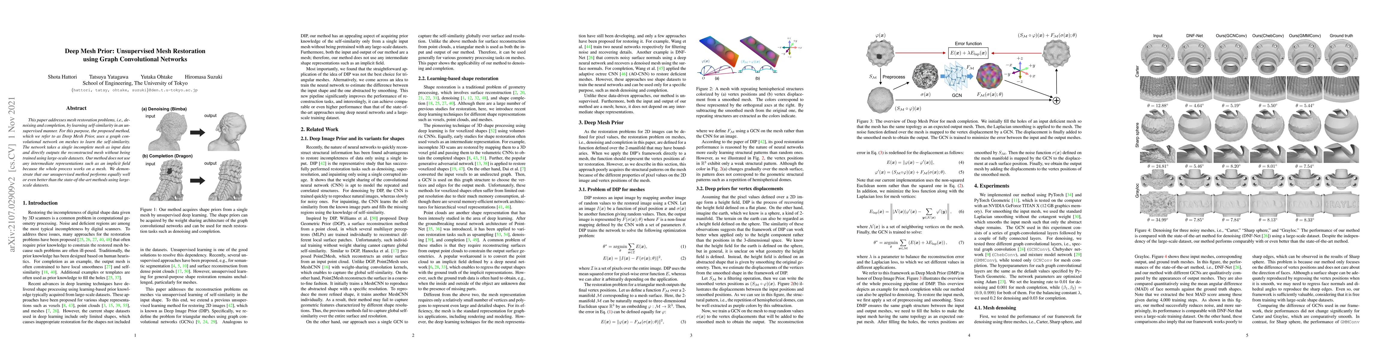 The Deep Mesh Prior method uses graph convolutional networks to perform unsupervised mesh restoration, achieving denoising and completion without large-scale datasets. It directly reconstructs meshes from incomplete data, demonstrating competitive performance against supervised state-of-the-art techniques.