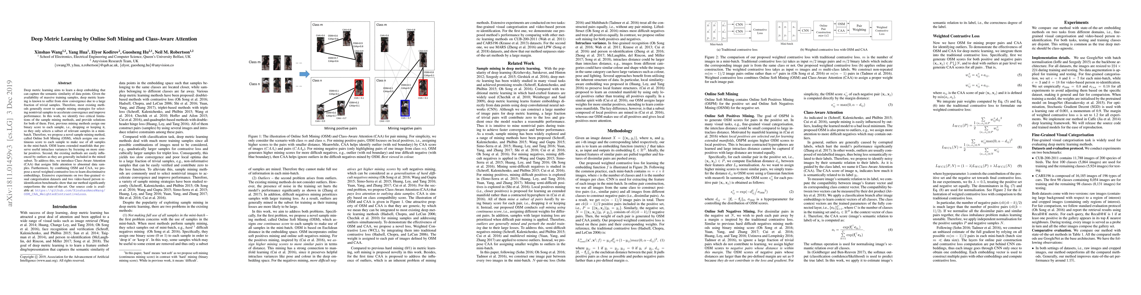 A new method for deep metric learning combines online soft mining to utilize all training samples and class-aware attention to filter out outliers, achieving better performance on visual categorization and person re-identification tasks.