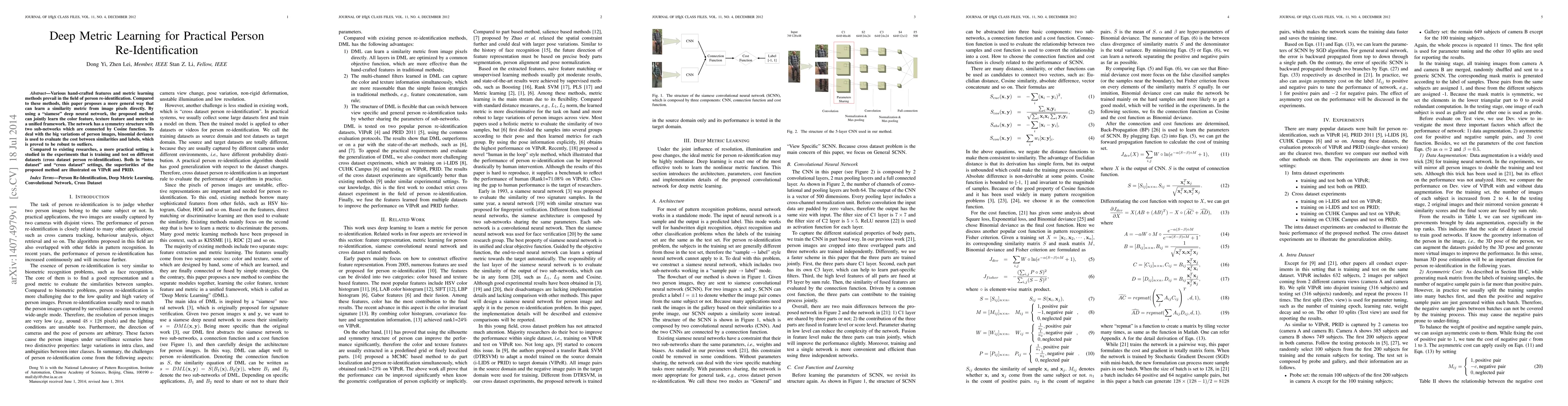 Various hand-crafted features and metric learning methods prevail in the field of person re-identification. Compared to these methods, this paper proposes a more general way that can learn a similarity metric from image pixels directly. By using a "siamese" deep neural network, the proposed method can jointly learn the color feature, texture feature and metric in a unified framework. The network has a symmetry structure with two sub-networks which are connected by Cosine function. To deal with the big variations of person images, binomial deviance is used to evaluate the cost between similarities and labels, which is proved to be robust to outliers. Compared to existing researches, a more practical setting is studied in the experiments that is training and test on different datasets (cross dataset person re-identification). Both in "intra dataset" and "cross dataset" settings, the superiorities of the proposed method are illustrated on VIPeR and PRID.