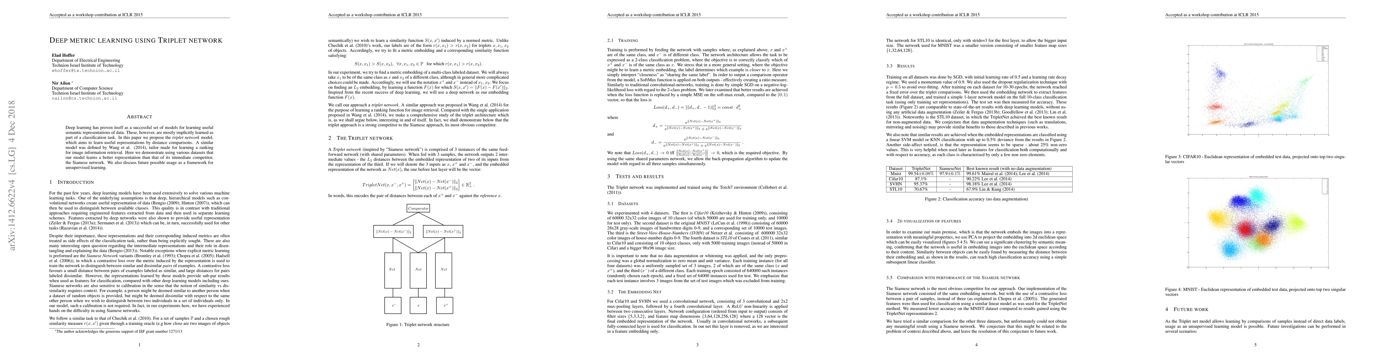 This paper introduces the Triplet network model for deep metric learning, demonstrating that it outperforms the Siamese network in learning useful data representations. The methodology involves learning through distance comparisons and suggests potential for unsupervised learning applications.