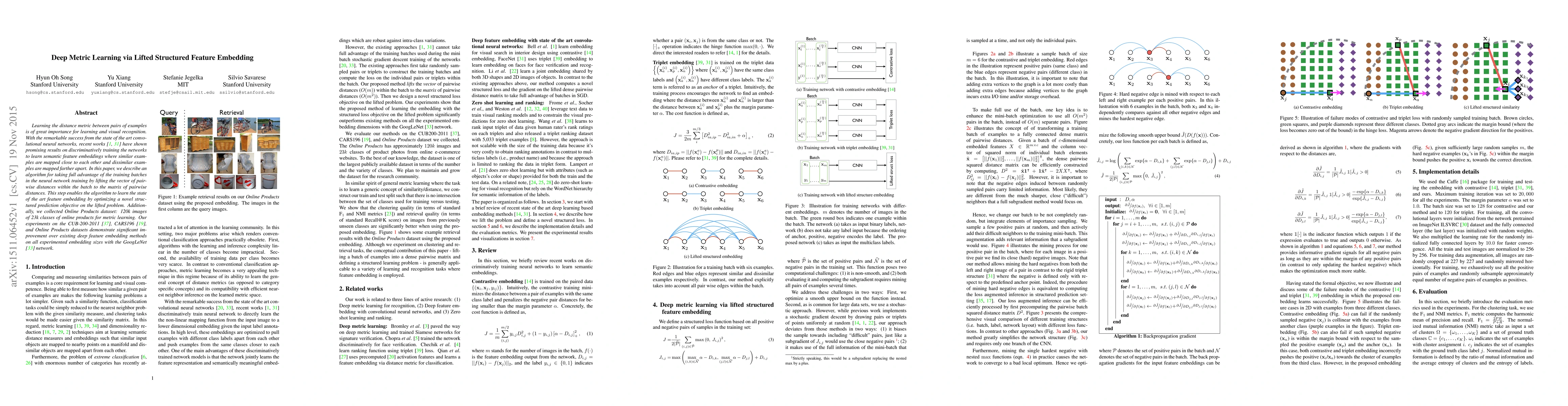 This paper proposes a deep metric learning method using lifted structured feature embedding to optimize the distance metric between pairs of examples. The algorithm leverages training batches to enhance feature embedding, achieving significant improvements over existing methods on multiple datasets using the GoogLeNet network.