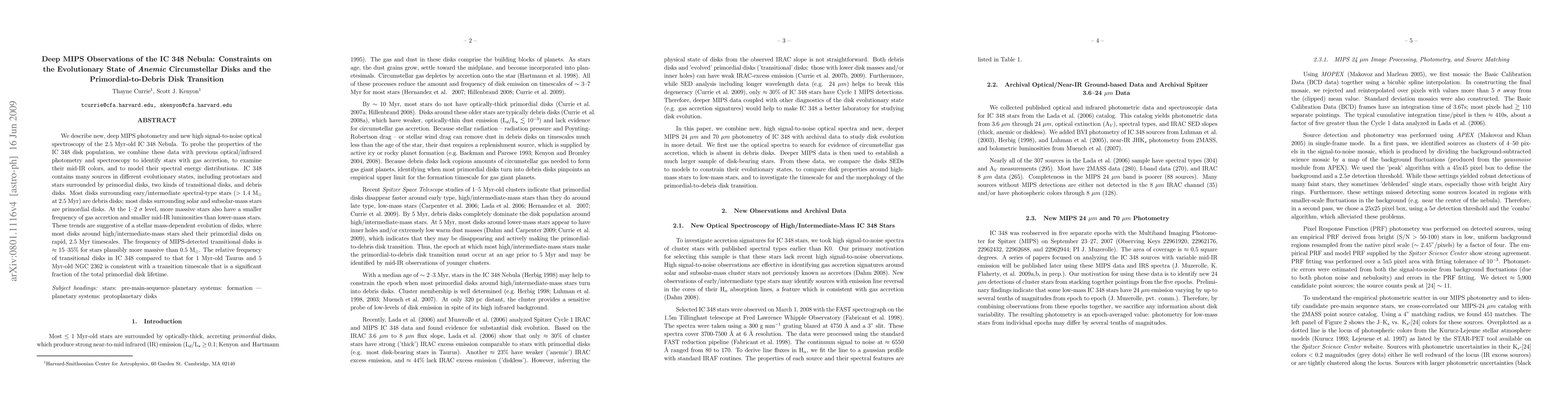 This paper uses deep MIPS photometry and high signal-to-noise optical spectroscopy to study the IC 348 Nebula, revealing that most disks around high/intermediate-mass stars evolve into debris disks within 2.5 Myr, while lower-mass stars retain primordial disks. Transitional disks are found in 15-35% of more massive stars, suggesting a mass-dependent disk evolution.
