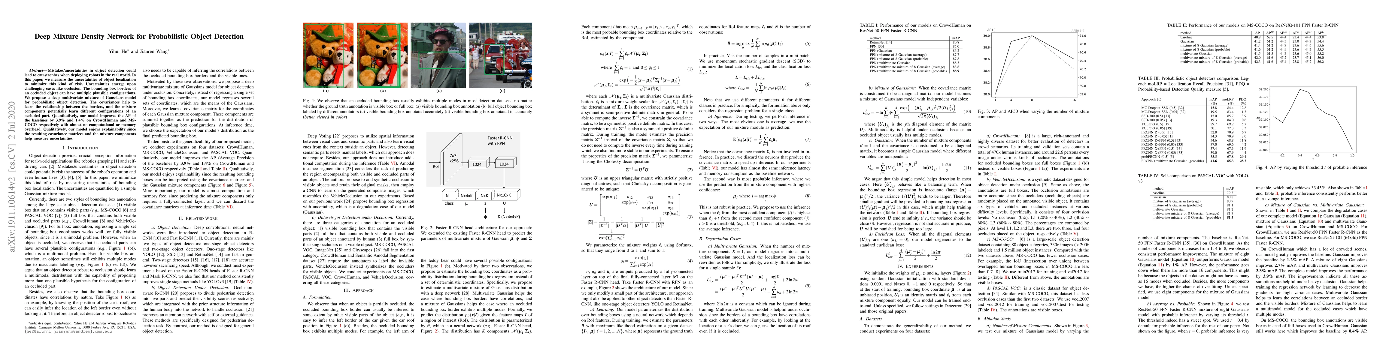 This paper proposes a deep mixture density network using a multivariate mixture of Gaussians to probabilistically detect objects, especially under occlusion. The model improves detection accuracy by 3.9% and 1.4% on CrowdHuman and MS-COCO datasets, while providing explainability through covariance matrices and mixture components to measure uncertainties.