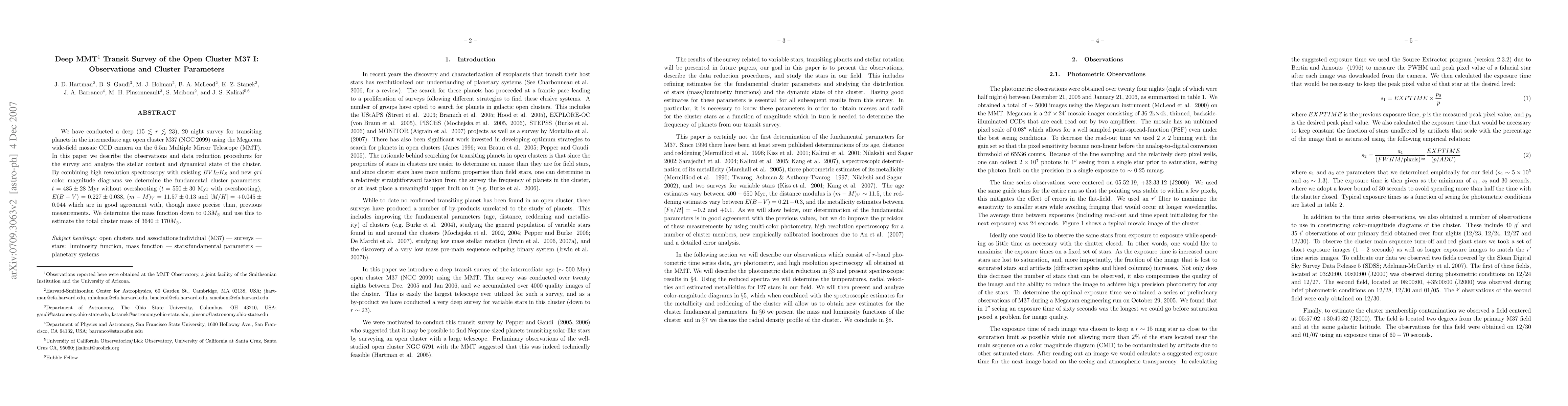 This paper details a deep transit survey for planets in the open cluster M37 using the MMT telescope, describing observations and data reduction. It analyzes the cluster's stellar content and dynamical state, determining precise fundamental parameters including age, extinction, distance, and metallicity, and estimates the total cluster mass.