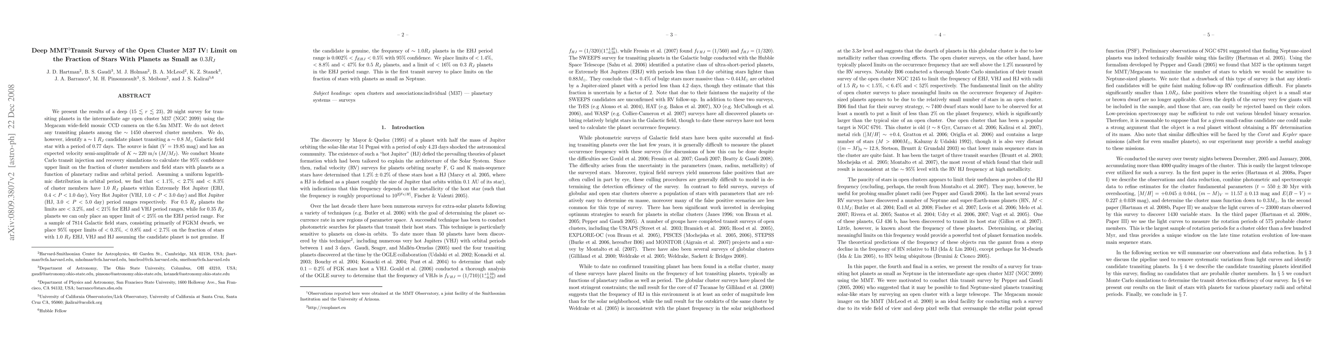 This study conducted a deep transit survey of the open cluster M37, revealing no transiting planets among ~1450 observed members. It sets upper limits on the fraction of stars with hot Jupiters and smaller planets, finding < 25% for 0.3 R_J planets in the shortest orbital period range, and < 0.5% for similar-sized planets in the field stars.