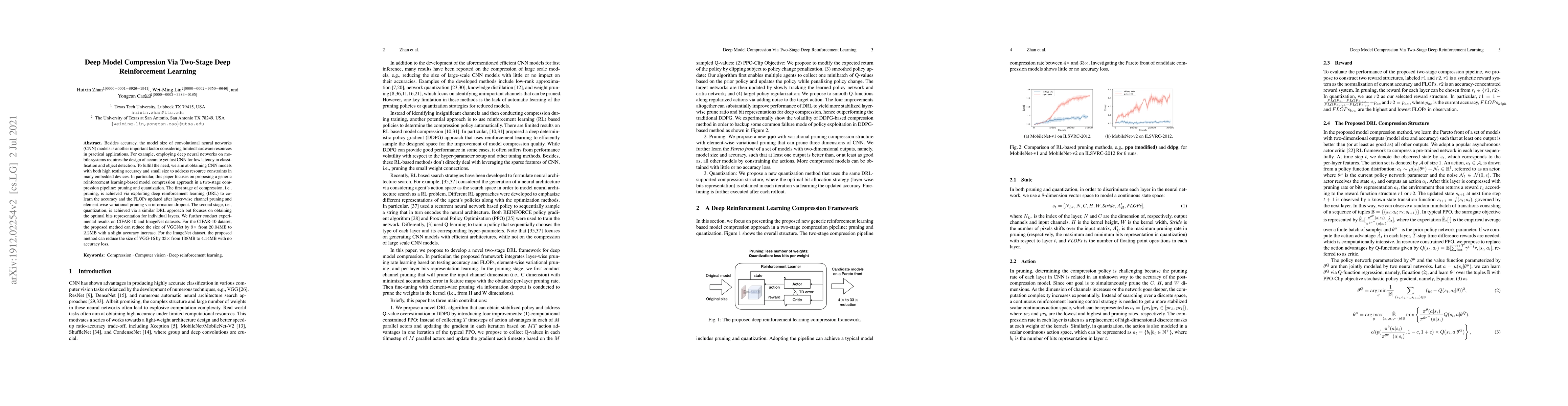 This paper proposes a two-stage deep reinforcement learning-based model compression method for CNNs, achieving significant size reduction while maintaining or improving accuracy. The first stage uses DRL for pruning, and the second stage uses DRL for quantization, demonstrating substantial reductions in model size on CIFAR-10 and ImageNet datasets without compromising accuracy.
