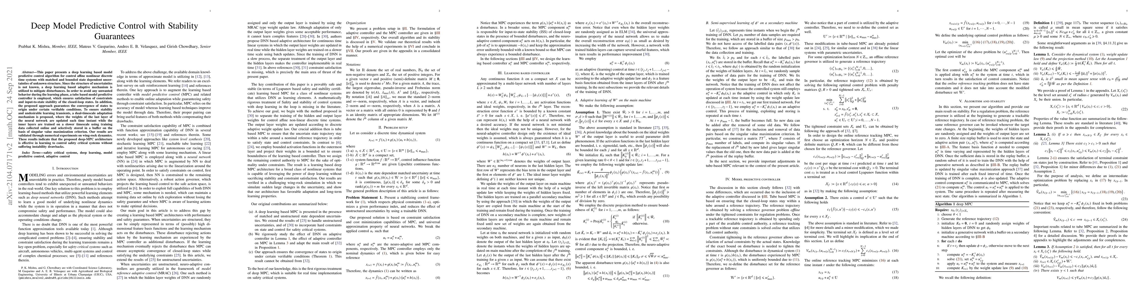 This paper proposes a deep learning-based model predictive control algorithm for nonlinear systems with unknown uncertainties, ensuring stability through adaptive mechanisms and dual-timescale neural network adaptation, validated by wing-rock dynamics experiments. The approach guarantees convergence and stability, effectively controlling safety-critical systems.