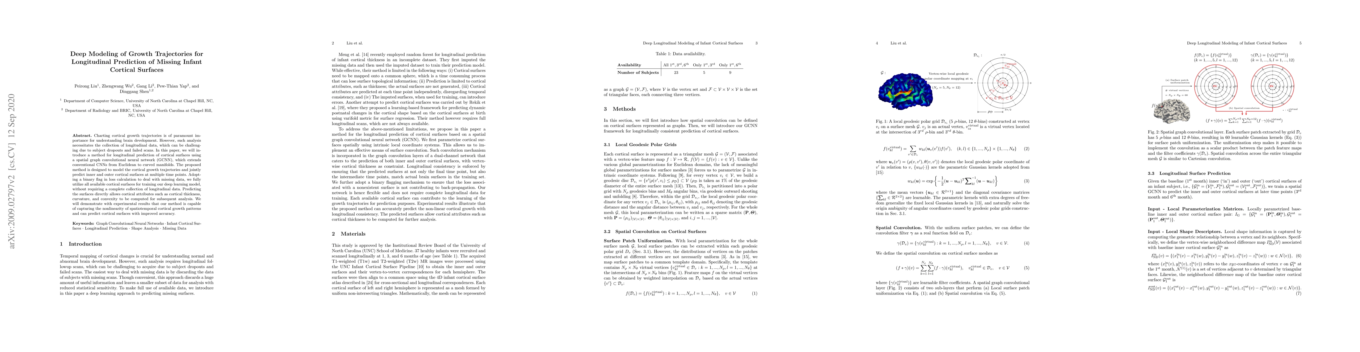This paper proposes a spatial graph convolutional neural network (GCNN) to model and predict cortical growth trajectories in infants, addressing missing data through a binary flag in loss calculation. The method predicts inner and outer cortical surfaces, capturing nonlinear spatiotemporal growth patterns and improving accuracy.