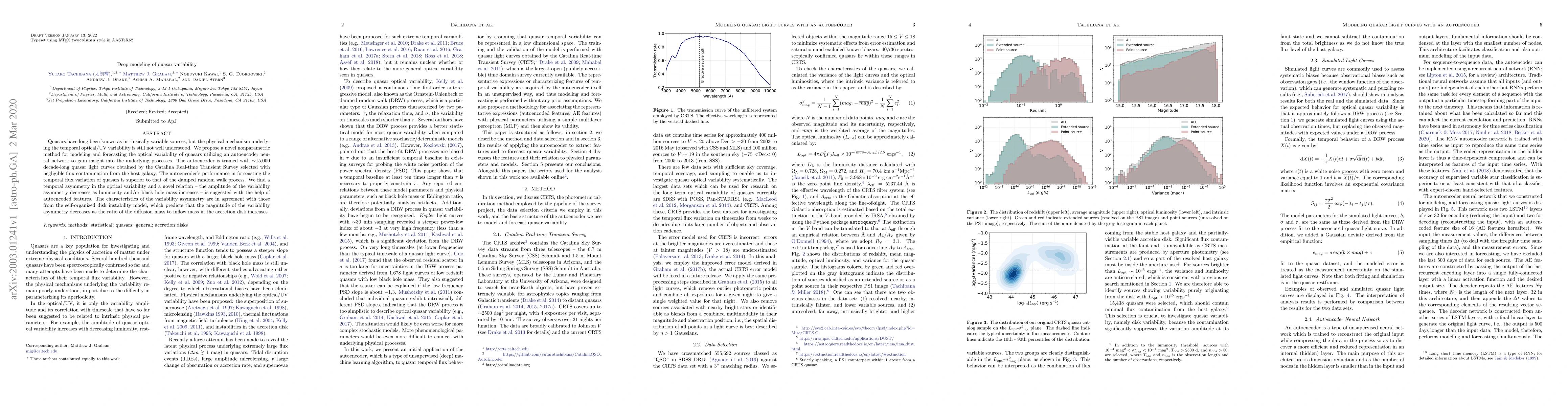 This paper introduces a novel autoencoder neural network for modeling and forecasting quasar optical/UV variability, demonstrating superior performance over traditional methods. The study reveals a temporal asymmetry in quasar variability and suggests a new relation linking variability amplitude to luminosity and black hole mass, consistent with the self-organized disk instability model.