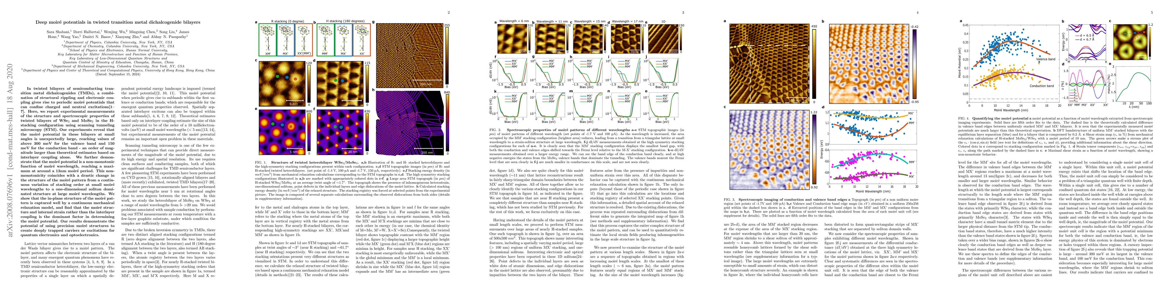 In twisted bilayers of semiconducting transition metal dichalcogenides (TMDs), a combination of structural rippling and electronic coupling gives rise to periodic moir\'e potentials that can confine charged and neutral excitations. Here, we report experimental measurements of the structure and spectroscopic properties of twisted bilayers of WSe2 and MoSe2 in the H-stacking configuration using scanning tunneling microscopy (STM). Our experiments reveal that the moir\'e potential in these bilayers at small angles is unexpectedly large, reaching values of above 300 meV for the valence band and 150 meV for the conduction band - an order of magnitude larger than theoretical estimates based on interlayer coupling alone. We further demonstrate that the moir\'e potential is a non-monotonic function of moir\'e wavelength, reaching a maximum at around a 13nm moir\'e period. This non-monotonicity coincides with a drastic change in the structure of the moir\'e pattern from a continuous variation of stacking order at small moir\'e wavelengths to a one-dimensional soliton dominated structure at large moir\'e wavelengths. We show that the in-plane structure of the moir\'e pattern is captured well by a continuous mechanical relaxation model, and find that the moir\'e structure and internal strain rather than the interlayer coupling is the dominant factor in determining the moir\'e potential. Our results demonstrate the potential of using precision moir\'e structures to create deeply trapped carriers or excitations for quantum electronics and optoelectronics.