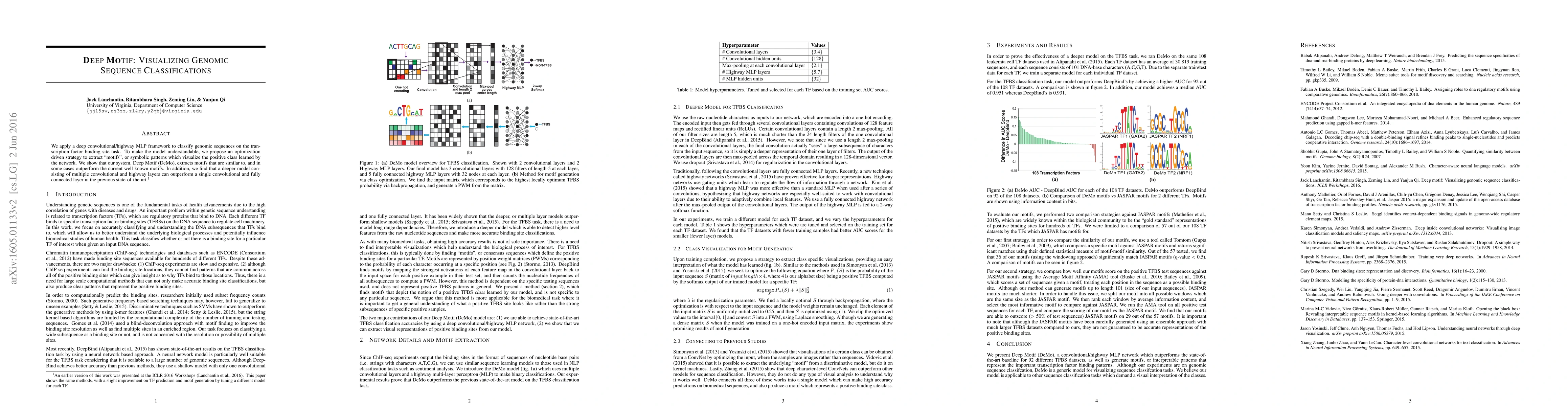 This paper applies a deep convolutional/highway MLP framework to classify genomic sequences on the transcription factor binding site task. To make the model understandable, we propose an optimization driven strategy to extract "motifs", or symbolic patterns which visualize the positive class learned by the network. We show that our system, Deep Motif (DeMo), extracts motifs that are similar to, and in some cases outperform the current well known motifs. In addition, we find that a deeper model consisting of multiple convolutional and highway layers can outperform a single convolutional and fully connected layer in the previous state-of-the-art.
