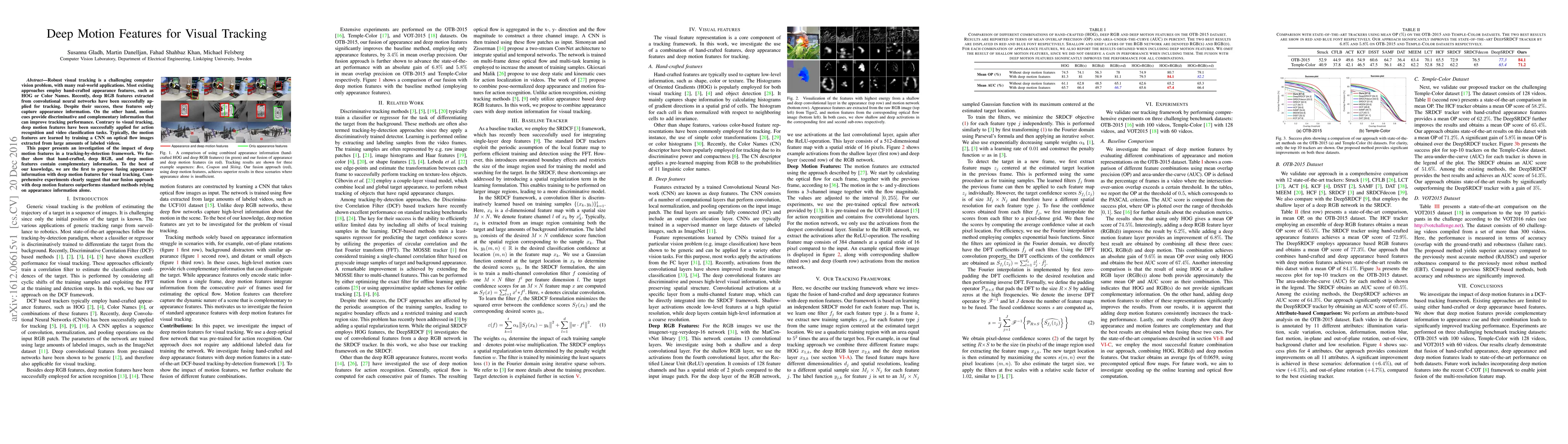 This paper investigates the integration of deep motion features into visual tracking, demonstrating that these features provide complementary information to traditional appearance-based methods. The proposed fusion of deep motion features with appearance information significantly outperforms existing tracking methods that rely solely on appearance cues.