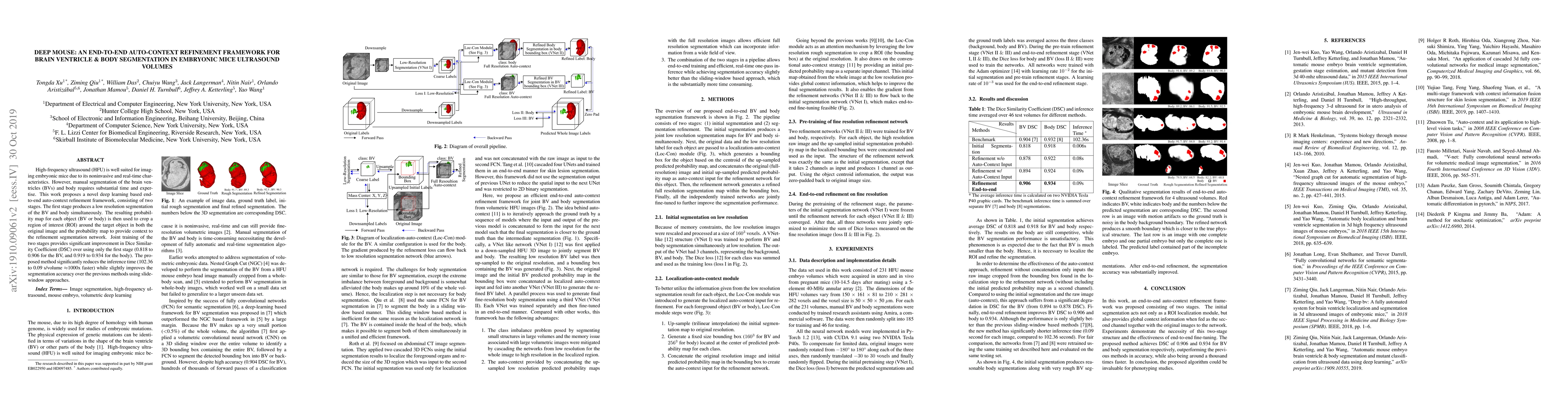 High-frequency ultrasound (HFU) is well suited for imaging embryonic mice due to its noninvasive and real-time characteristics. However, manual segmentation of the brain ventricles (BVs) and body requires substantial time and expertise. This work proposes a novel deep learning based end-to-end auto-context refinement framework, consisting of two stages. The first stage produces a low resolution segmentation of the BV and body simultaneously. The resulting probability map for each object (BV or body) is then used to crop a region of interest (ROI) around the target object in both the original image and the probability map to provide context to the refinement segmentation network. Joint training of the two stages provides significant improvement in Dice Similarity Coefficient (DSC) over using only the first stage (0.818 to 0.906 for the BV, and 0.919 to 0.934 for the body). The proposed method significantly reduces the inference time (102.36 to 0.09 s/volume around 1000x faster) while slightly improves the segmentation accuracy over the previous methods using slide-window approaches.