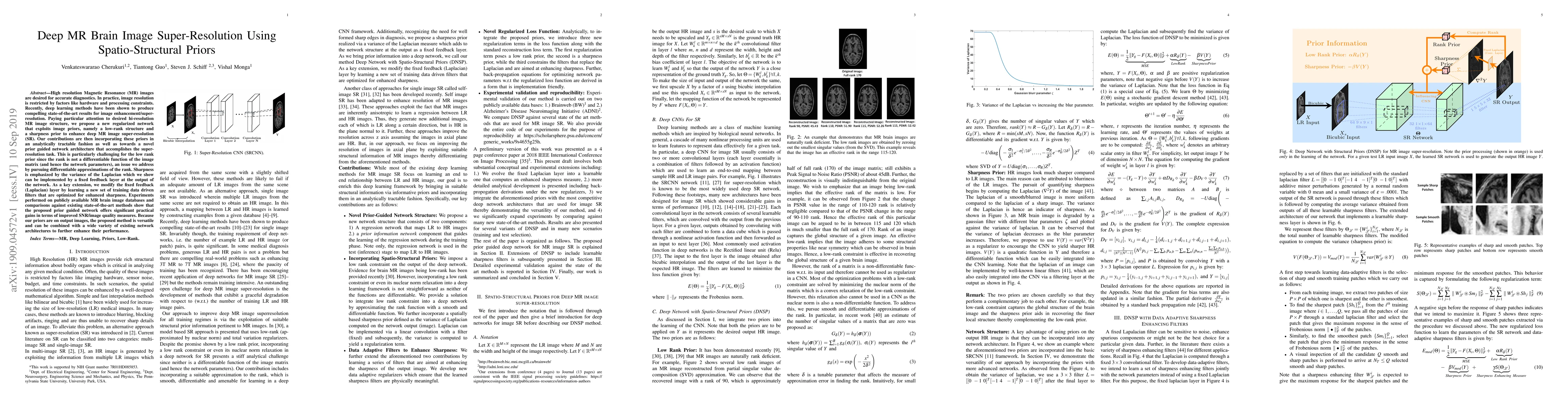This paper proposes a novel deep learning network for enhancing the resolution of MR brain images by incorporating low-rank and sharpness priors. The method addresses the non-differentiability of the low-rank prior through differentiable approximations and optimizes sharpness using learned Laplacian filters, achieving superior image quality and SNR compared to existing methods.