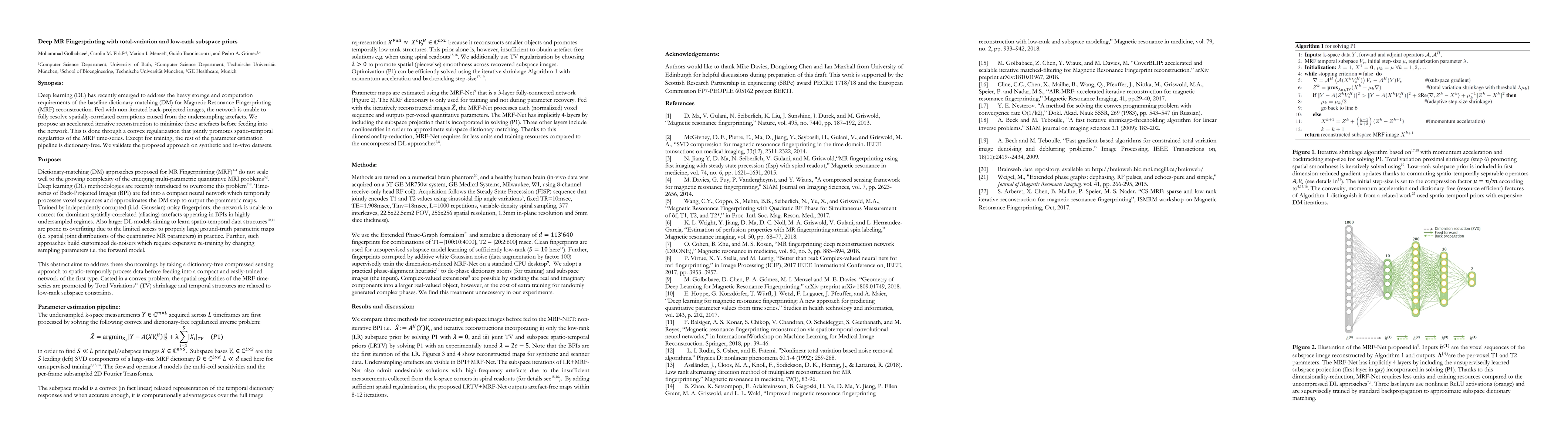 This paper proposes an accelerated iterative reconstruction method using total-variation and low-rank subspace priors to minimize undersampling artefacts in Magnetic Resonance Fingerprinting (MRF) reconstruction. The approach aims to enhance the performance of deep learning reconstruction by addressing spatially-correlated corruptions before network input.