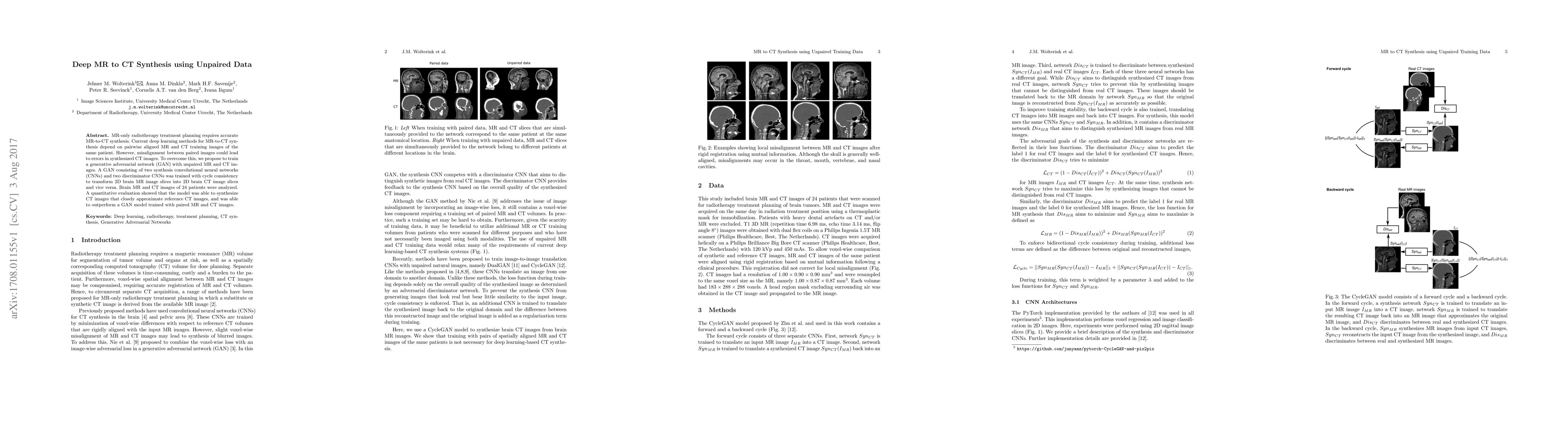 This paper proposes a GAN-based method for synthesizing CT images from MR images using unpaired data, addressing the issue of misalignment in paired images. The model, trained with cycle consistency, successfully transforms brain MR slices into CT slices and vice versa, outperforming paired-data-trained GANs in quantitative evaluations.