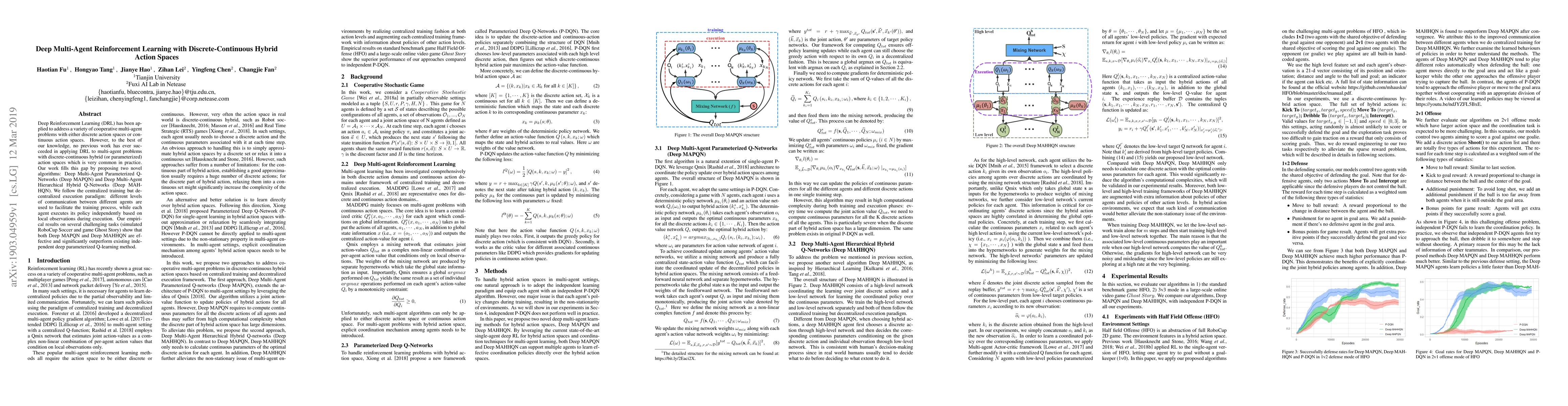 This paper proposes two novel deep reinforcement learning algorithms, Deep MAPQN and Deep MAHHQN, to tackle multi-agent problems with discrete-continuous hybrid action spaces. Using centralized training and decentralized execution, the algorithms significantly outperform existing methods on tasks like RoboCup Soccer and Ghost Story.