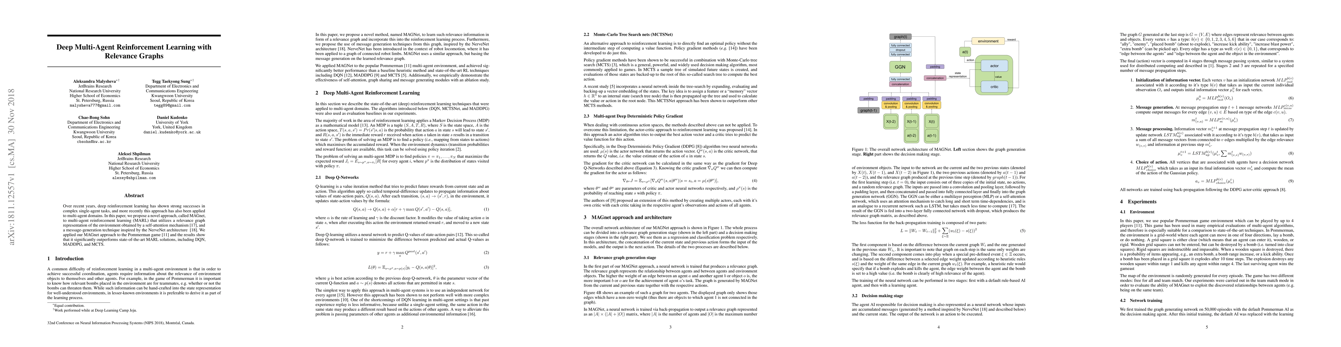 This paper introduces MAGnet, a novel deep reinforcement learning approach for multi-agent reinforcement learning (MARL) using relevance graphs and self-attention mechanisms. Applied to the Pommerman game, MAGnet outperforms existing MARL methods like DQN, MADDPG, and MCTS.
