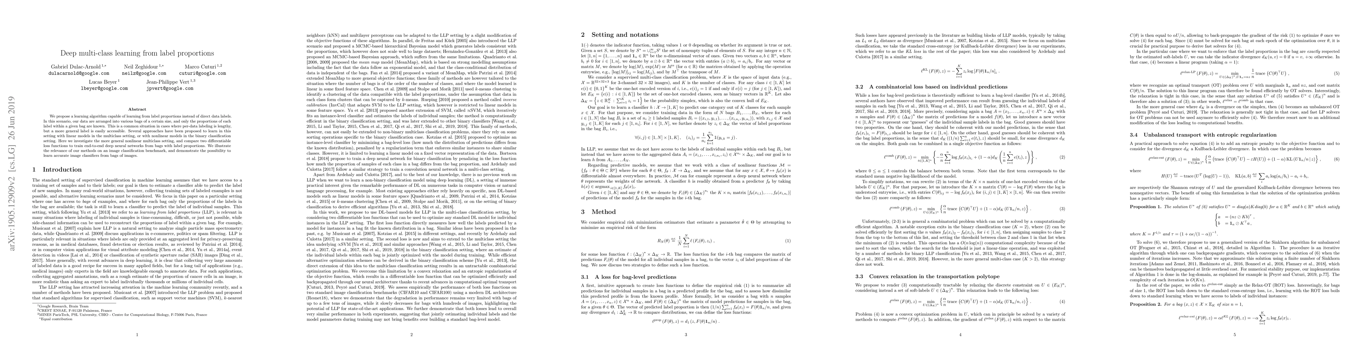 This paper proposes a deep learning algorithm to classify data from label proportions within bags, where only the proportion of each label is known, instead of explicit labels. It compares two differentiable loss functions to train deep neural networks and demonstrates effective multiclass learning on an image classification benchmark.