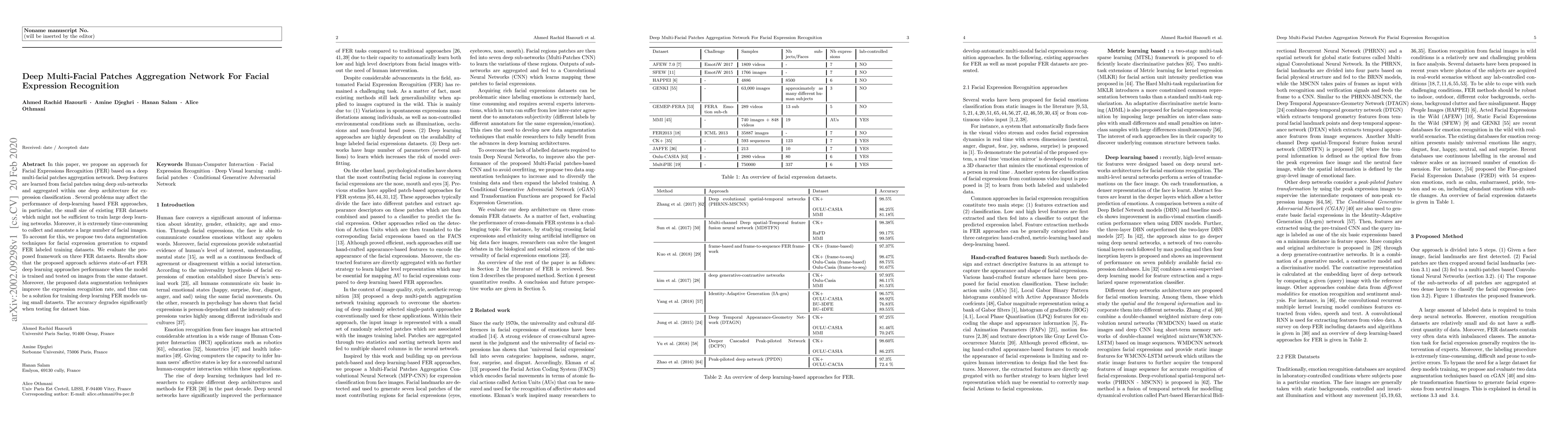 This paper introduces a deep multi-facial patches aggregation network for facial expression recognition, addressing the challenge of small training datasets through data augmentation techniques. The proposed method achieves state-of-the-art performance on the same dataset but shows significant accuracy drop when tested across different datasets.