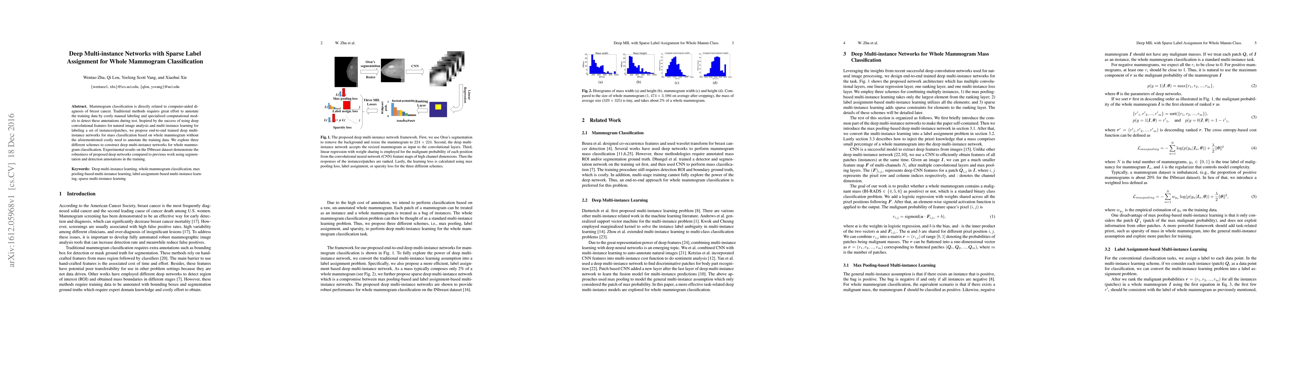 This paper proposes deep multi-instance networks for classifying whole mammograms without the need for costly manual annotations. The approach leverages deep convolutional features and multi-instance learning, demonstrating robustness on the INbreast dataset compared to traditional methods.
