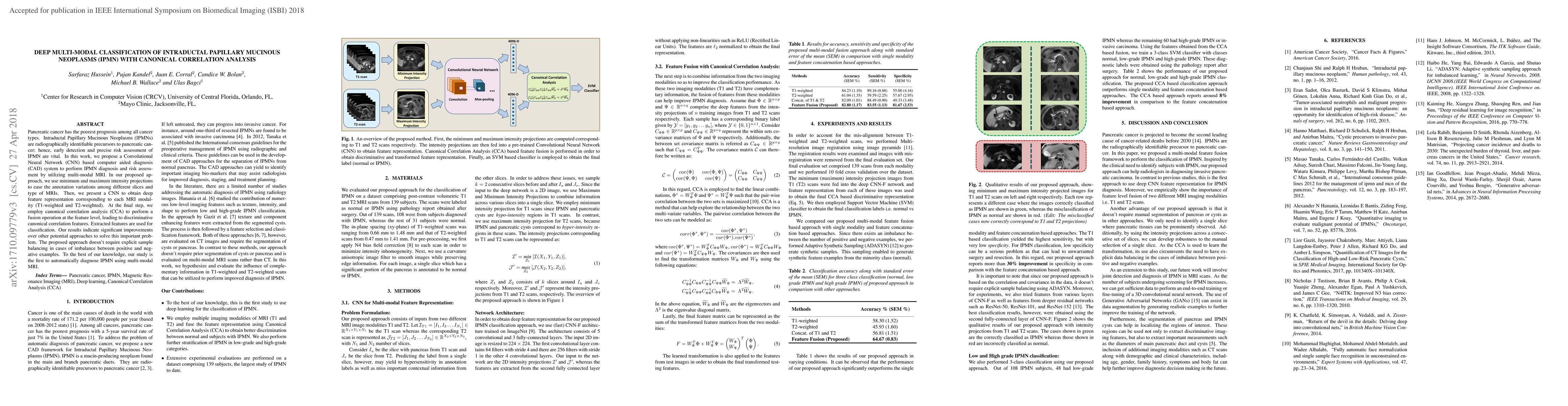 This paper proposes a CNN-based CAD system for diagnosing and assessing risk of Intraductal Papillary Mucinous Neoplasms (IPMN) using multi-modal MRI, employing CCA for feature fusion and achieving significant improvements over other methods. The approach does not require explicit sample balancing for imbalanced datasets.